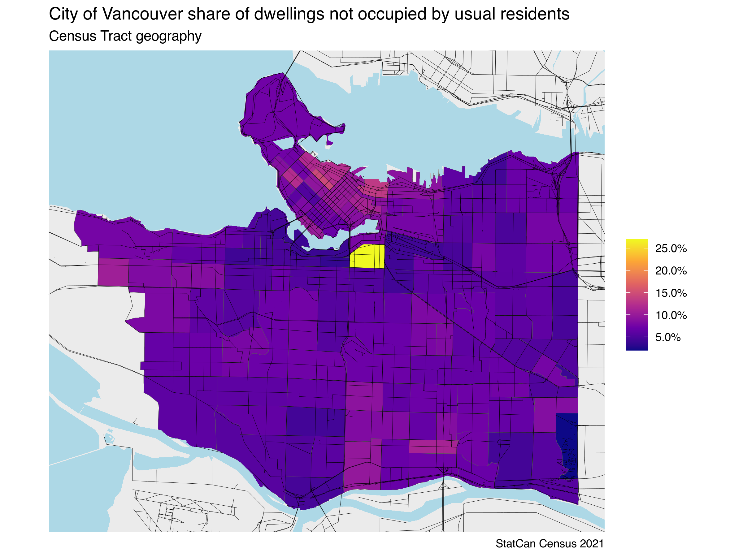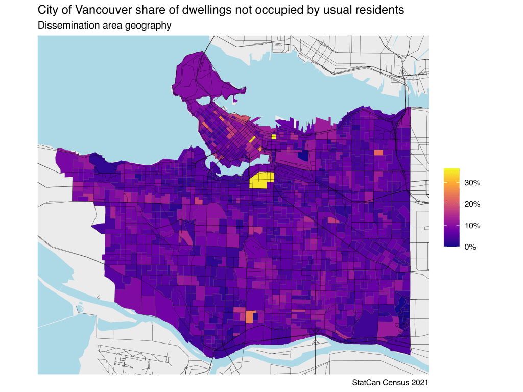 Finally, let’s turn to the geographic distribution of Dwellings Unoccupied by Usual Residents, plotting the new 2021 data for the City of Vancouver at the Census Tract level.