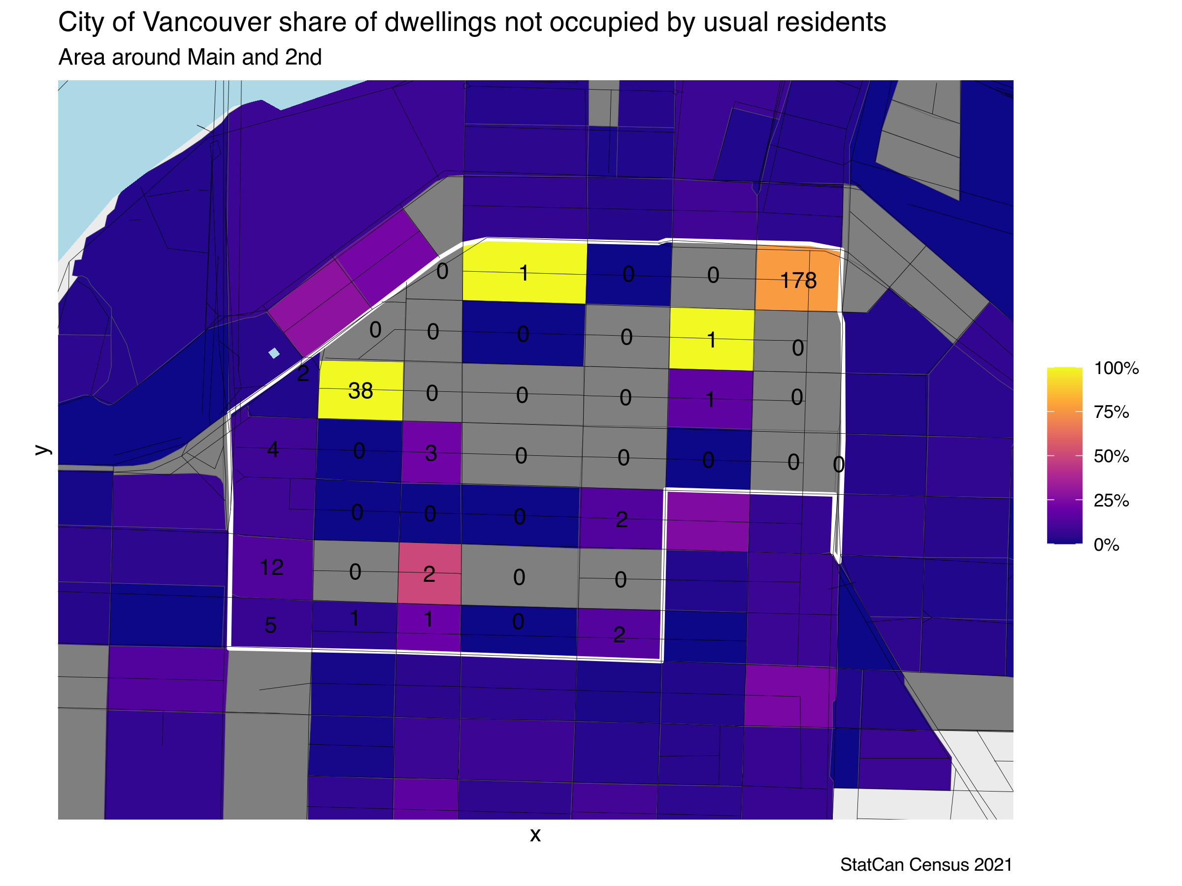 One census tract, Census Tract 9330049.05 south of 2nd Ave between Cambie and Main, stands out with 27% of dwellings not occupied by usual residents. Let’s take a closer look and try and get ahead of silly arguments like commentators claiming that “speculation is one of our prime suspects” or running headlines decrying this as a case of empty or underused housing.