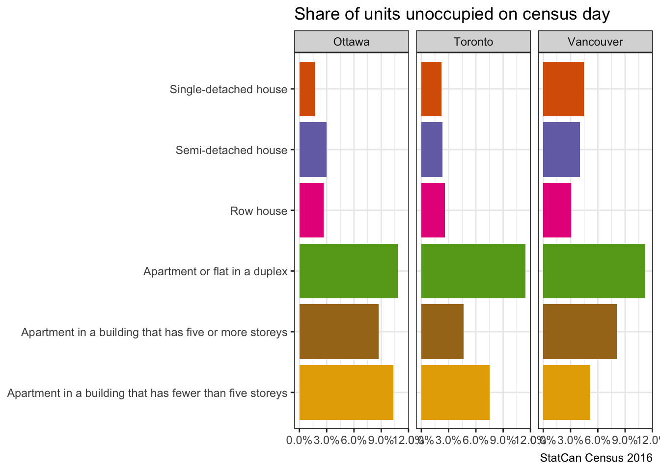 Refined data from the 2016 Census (not yet available in 2021) also enables us to split out unoccupied units by structural type of dwelling. Let’s take a look at what this looks like for three Canadian cities: the City of Vancouver, City of Toronto, and City of Ottawa.