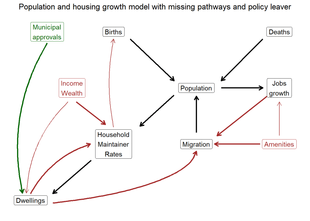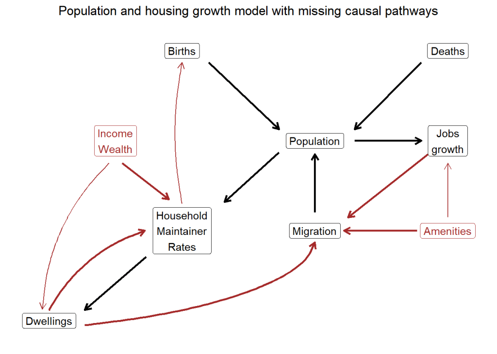 We added a bunch of factors and causal pathways. Most importantly, dwelling growth impacts both (net) migration and household maintainer rates. Demographers understand this when they talk about the “two-sided relationship” between population and dwelling growth. Similarly, this is what economists mean when they say population and dwelling growth are endogenous.