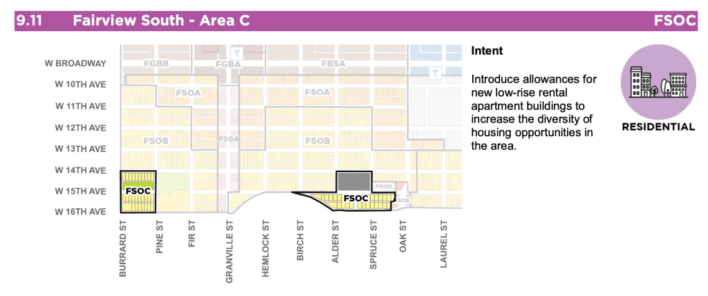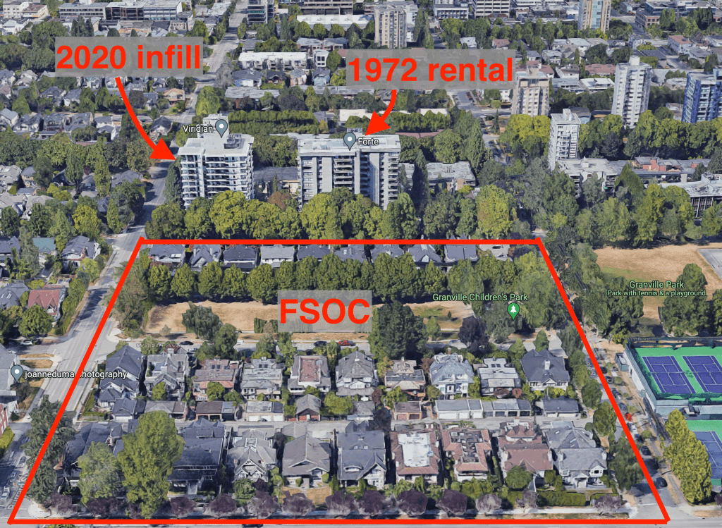 Planners think the FSOB area just to the north is good for up to 6.5 FSR, with 20 storey towers conditionally allowed on some sites, but the highlighted FSOC areas only allow for a maximum of 6 storeys 2.7 FSR rental buildings. As an example, let’s take a look at the existing built form around the leftmost of the two FSOC areas looking north toward the FSOB.