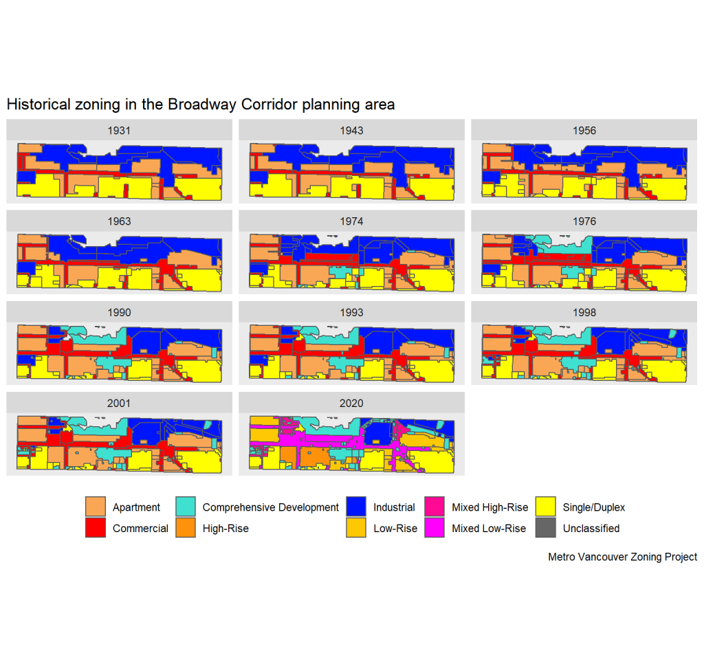 Using maps we’ve assembled from archival research for the Metro Vancouver Zoning Project, we can put together an historical comparison of how zoning along the Broadway Corridor has changed. This won’t catch all the change, and as we’ll discuss in a minute, that’s an important caveat! Nor have we fully back-coded our historical data to match with our most recent data, refining and harmonizing what our zoning codes are actually allowing. But we can still get a glimpse of some of the changes that have occurred just by looking at the maps.