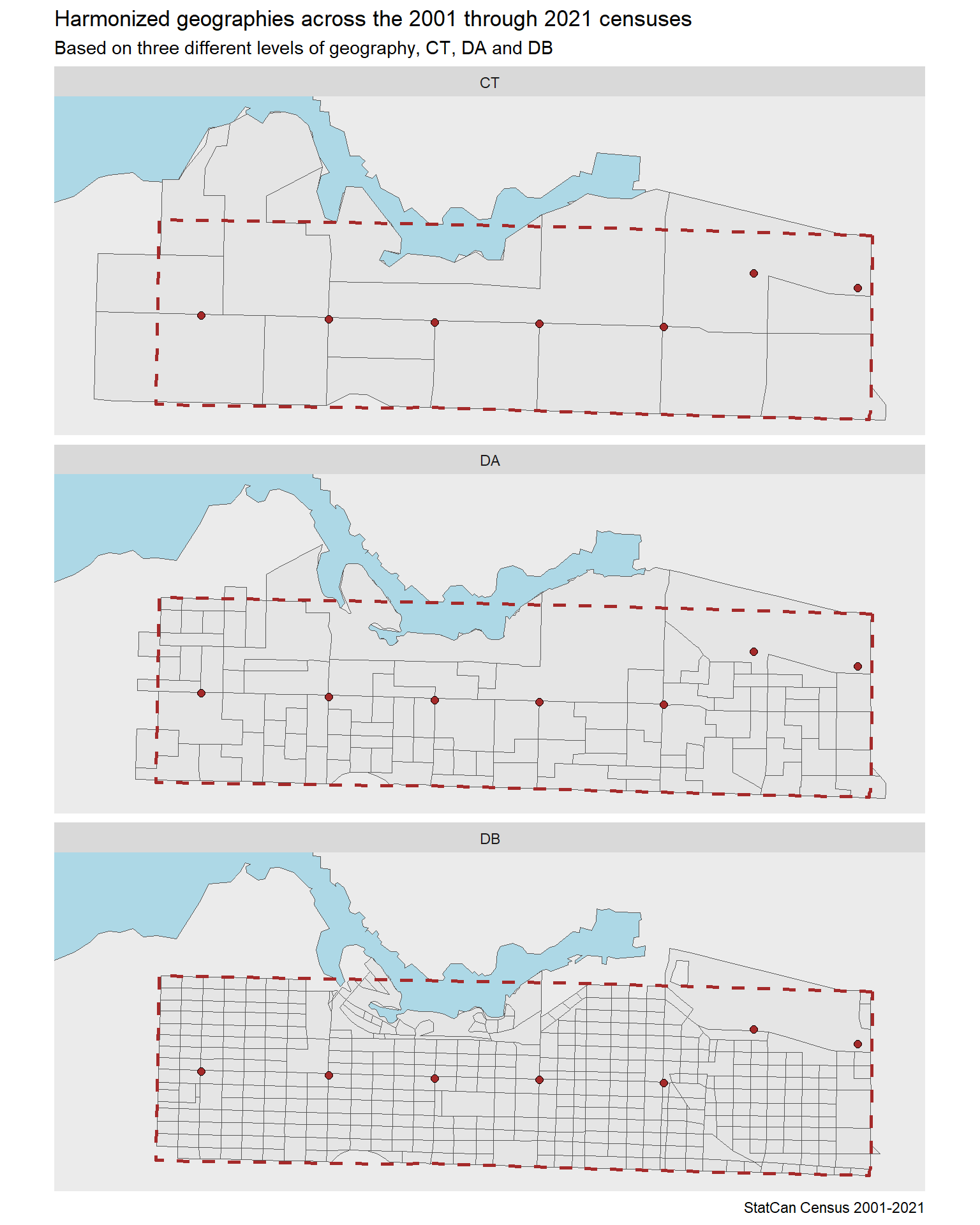 The Broadway Plan document chooses to use census tracts as the basis for census data for the Broadway Plan, and to track changes in the corridor since 2001. This is a fairly coarse geography choice since census tracts are rather large and extend quite a bit beyond the outlined area. Dissemination area data is available for all censuses since 2001 and is much better suited to approximate the corridor. If only data on population, households or dwellings is required, then dissemination block data can give even better estimates.