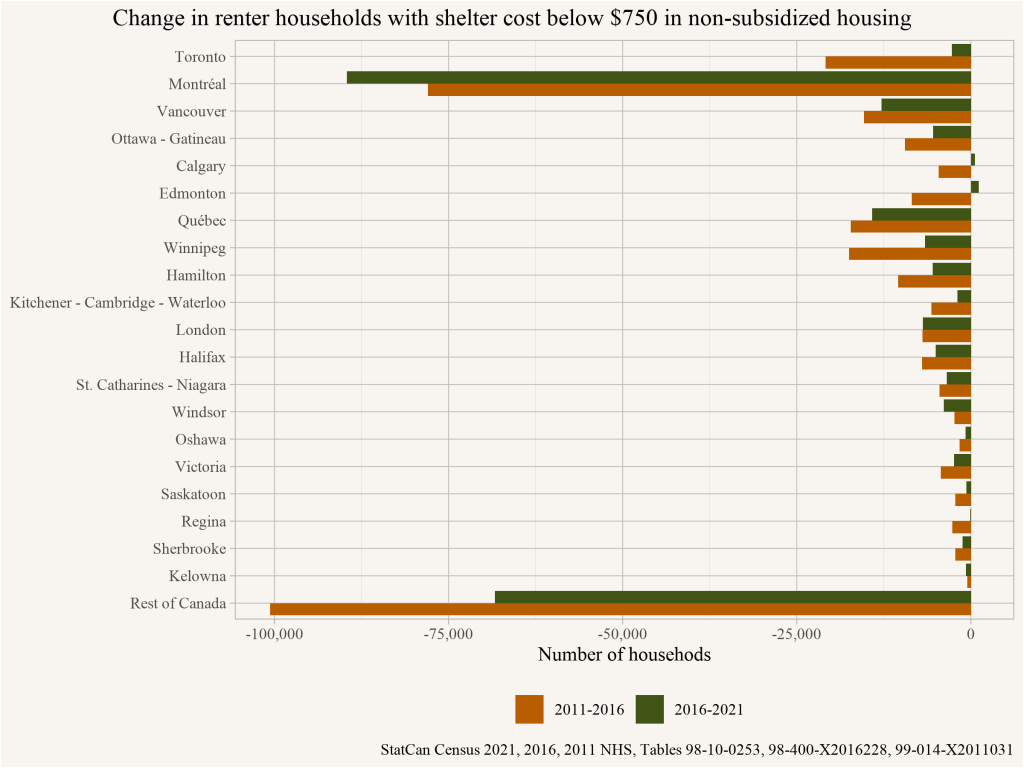 This again highlights that most of the losses were in Montréal and regions outside of the main metro areas. The number of households with shelter cost below $750 in Calgary and Edmonton increasing 2016-2021 shows that this isn’t necessarily a one-way street. Units renting below $750 at any given point in time aren’t separate from the rest of the housing market, and their asking rents can go up or down depending upon what’s going on elsewhere in the market.