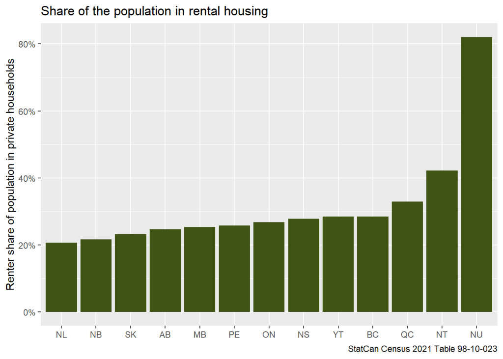 Here we definitely see room for improvement. Not just when it comes to some of the issues already outlined above. It’s important for ministers to get simple things right, like the the unfortunate claim that “BC has more renters per capita than any part of Canada.” Which is obviously (to anyone who spent any time looking at housing across Canada) false no matter how one slices the data. Here is a simple graph of the share of the population in renter households across Canadian provinces and territories.
