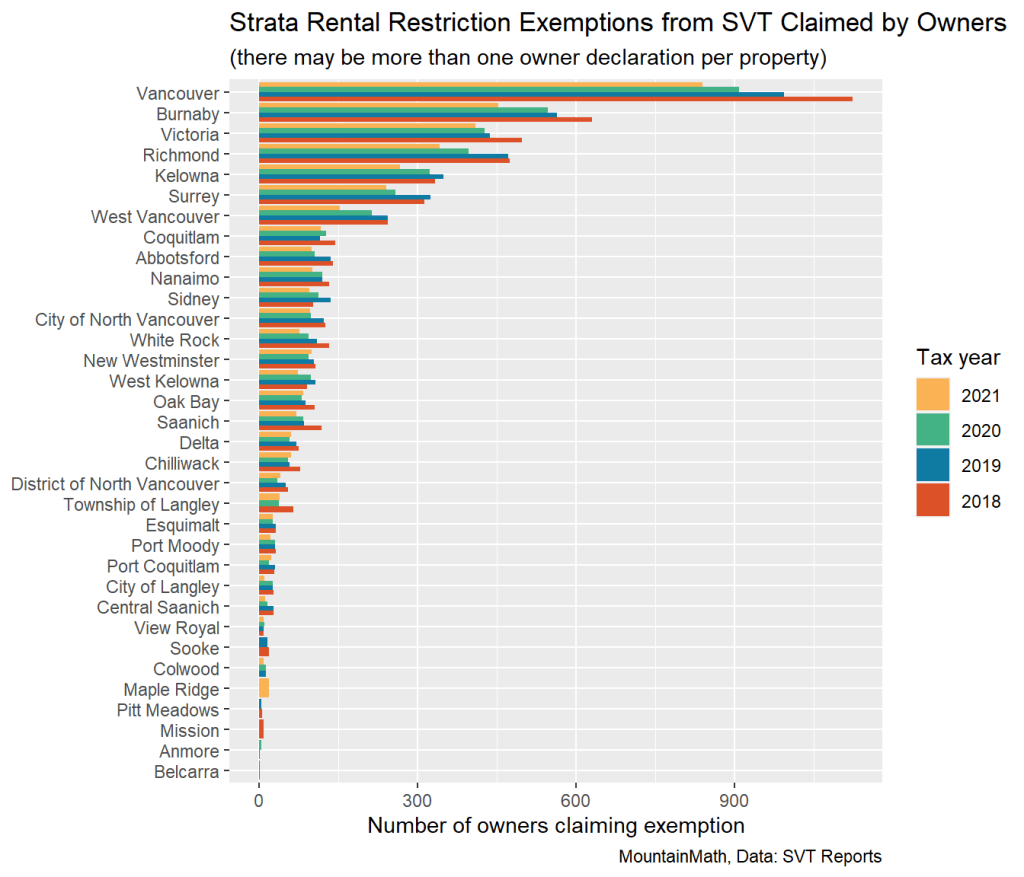 Drawing upon the latest report (just released after Eby’s press conference!) we can also check how rental restriction exemptions have been distributed spatially. Again, we draw upon owners claiming rental restrictions rather than strata units.
