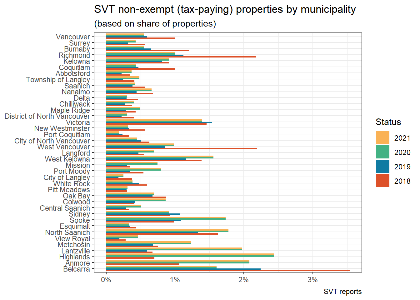 As usual, the code for this post is available on GitHub for anyone to reproduce or adapt. This includes code for scraping SVT data out of their PDF reports which is necessary only because of BC broken data practices that default to not making data available but hiding it away in reports, if at all. In a similar vein, this post can’t provide more accurate estimates on strata properties with various forms of rental restrictions because this in part requires access to BC Assessment data which the BC government chooses to continue to keep locked up in order to sell it. (The other important ingredient for these estimates is building on work done by Doug Harris who has researched strata restrictions in BC in great detail.)