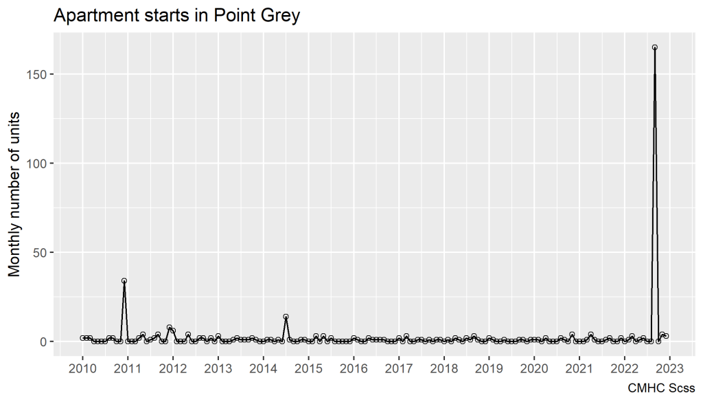 And as one might have expected, very few apartments have been built. A recent low-rise mixed-use commercial (C-2 zoning) with 36 apartments over top shows up as a 2010 start (completed in 2012 near Discovery & 10th). Some of the rest of the low level noise is due to secondary suites, which CMHC data counts as single rental apartment units. The apartment ban gradually installed through the transition from the Zoning for Growth to the Spot Discretionary Regime has been very effective in Point Grey. As a result, the Broadway/Alma project registering as a 2022 start really stands out.
