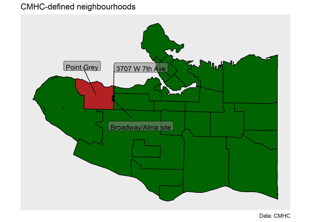 Let’s take a look more broadly how this has played out in the Point Grey neighbourhood, where the Alma/Broadway project, as well as the apartment building from 1970 pictured above, are located. Here is how this neighbourhood is defined in CMHC data.