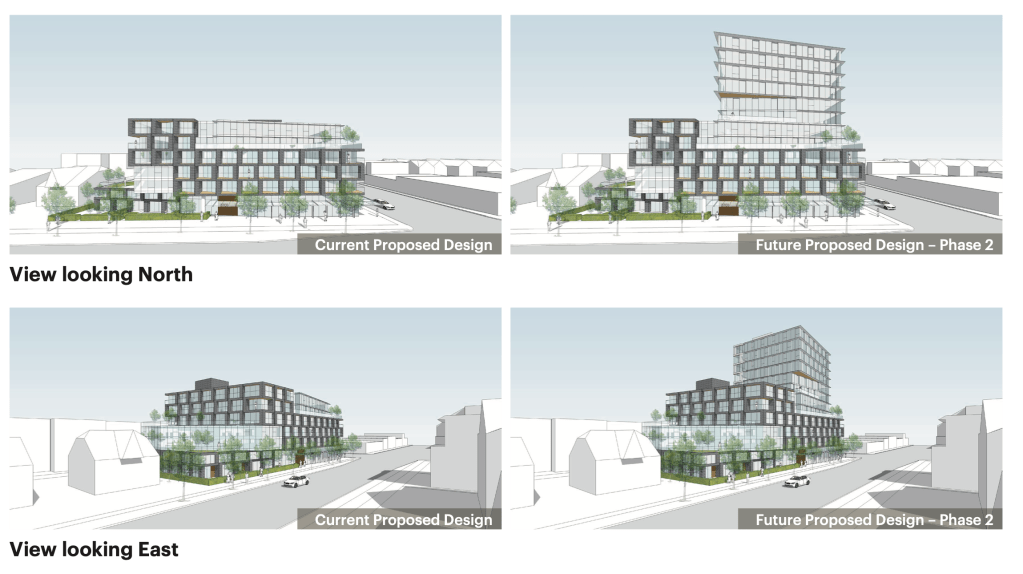 An initial rezoning application came in in December 2016 with open house in April 2017 to develop six-storey mixed-use structure with 94 rental apartments, built in a way so that another 6 storeys could be added at some later point in time. Adding floors to an existing building is such a great way to add housing that Germans invented a whole new word for it. But typically new floors are added decades or even centuries after a building was built, when the urban environment changes and the complex work to add floors to an existing building becomes economically viable. In this case the final 12 storey building was already economically viable, but politically it was dead in the water. Therefore the developer opted for the more costly two-phase approach, building a six-storey building immediately, but designing it in a way so that another 6 storeys could be added later if and when the political climate shifted.