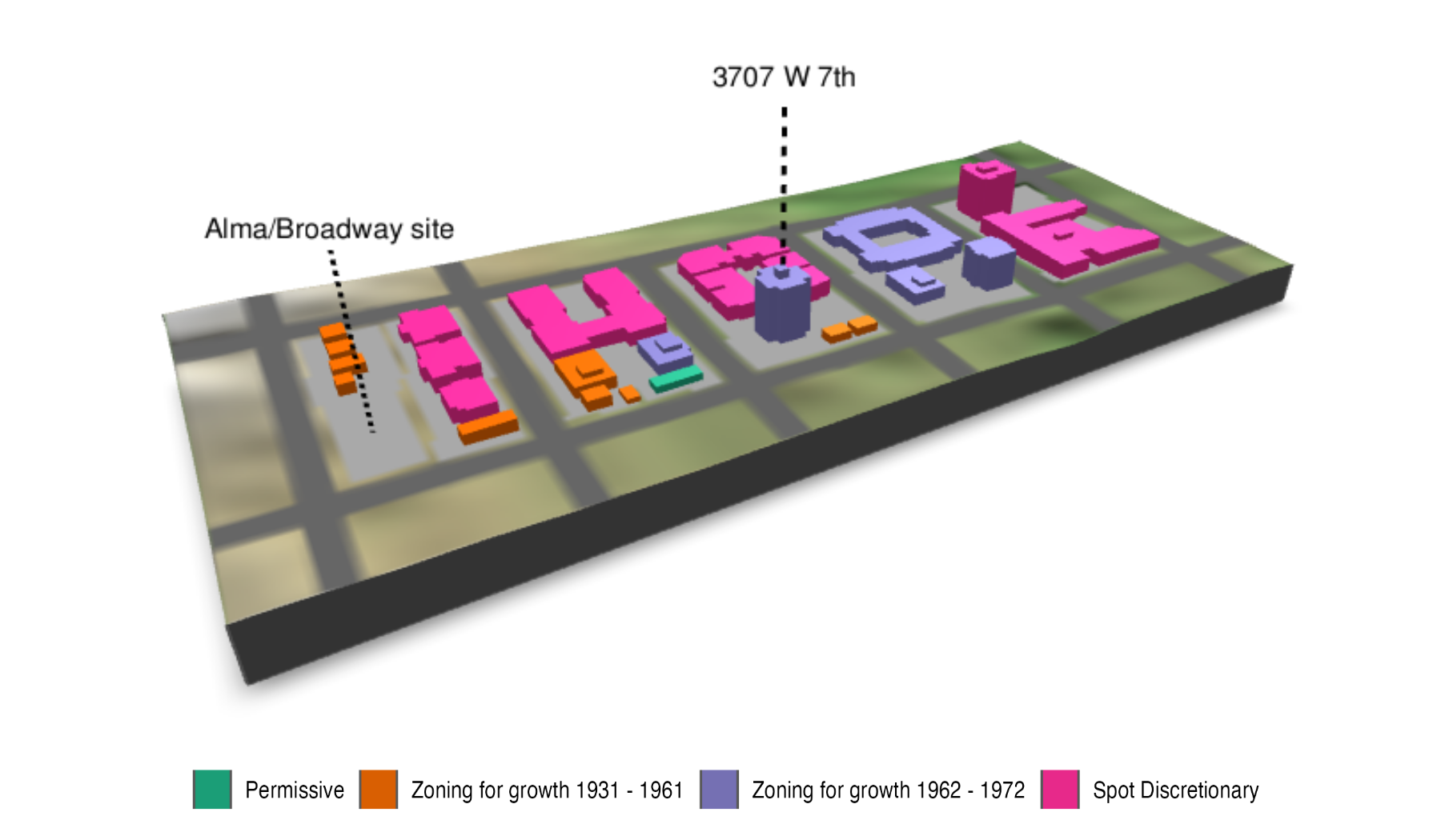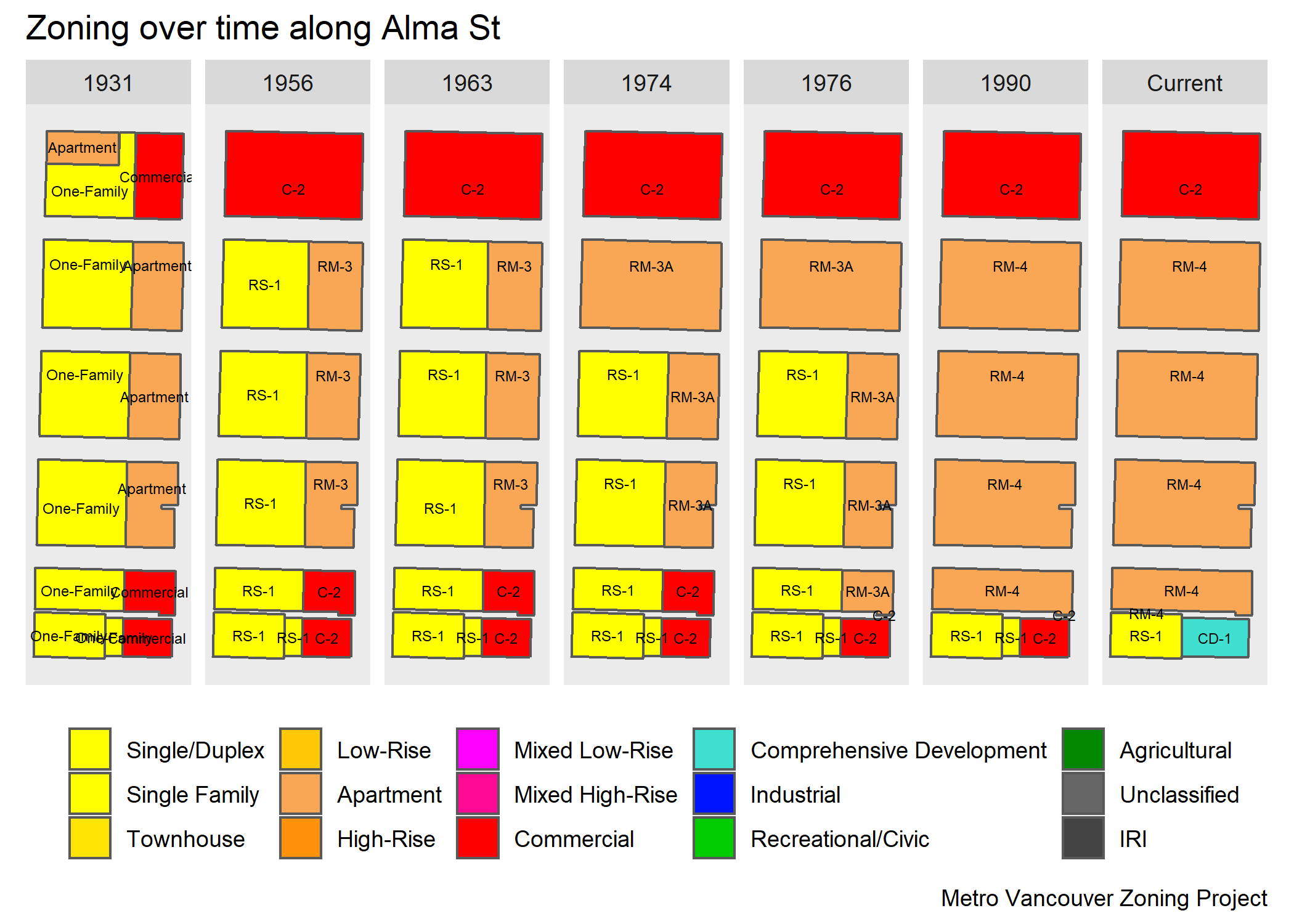 For our case studies, we’re going to zoom in on the miniature Alma corridor between Broadway and 4th Avenue. Let’s have a look at how our regimes have played out via the history of zoning along this corridor. Here we draw heavily from our CMHC-funded project on zoning history.