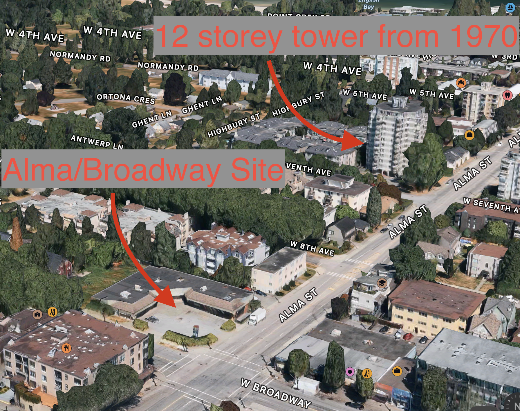 So let’s compare our two focus tower developments, the 1970 12-storey rental apartment on 7th and Alma and the currently under construction 14 storey MIRHPP at Broadway and Alma!