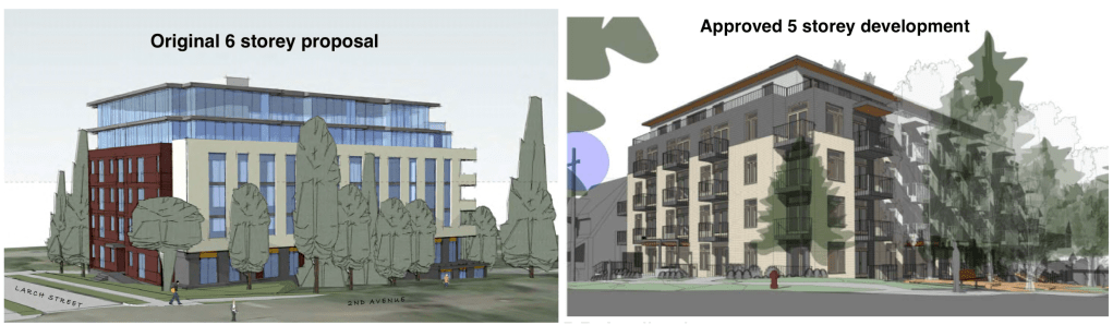 The development around 708 Renfrew Street proposed under the Affordable Housing Choices (AHC) Policy did not see a reduction in the nominal number of storeys, but saw significant massing changes with the original proposal 43% times larger than the version that eventually got approved. However, the reduction in housing units seems to have ultimately proven fatal to the project’s viability, and the developer abandoned the project.