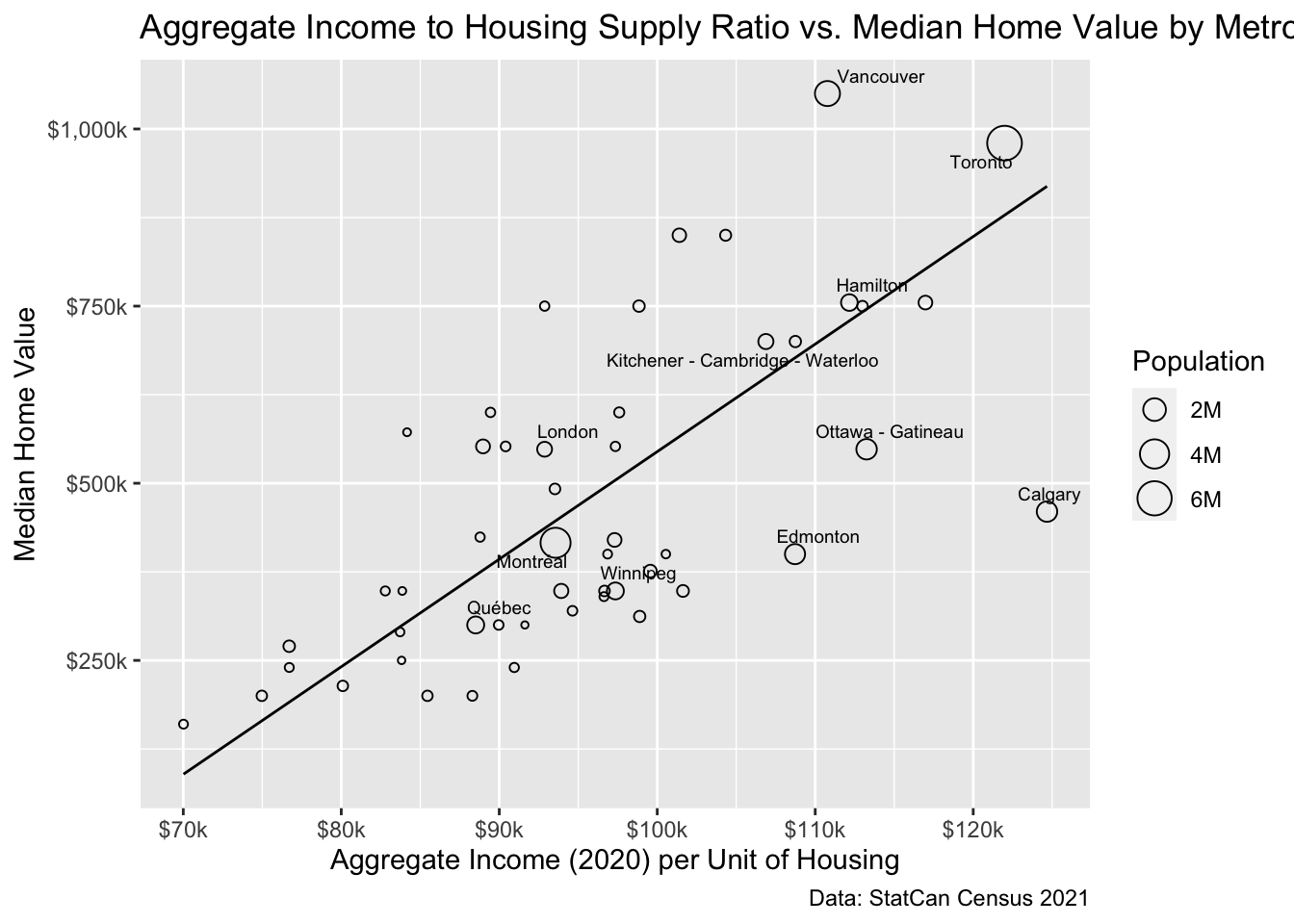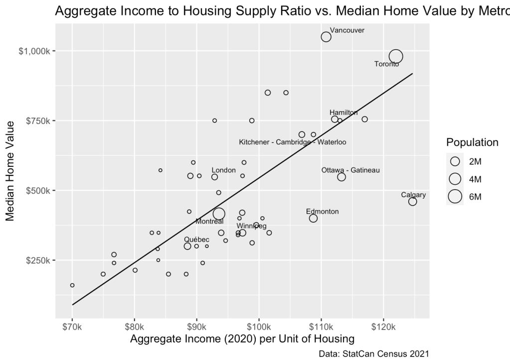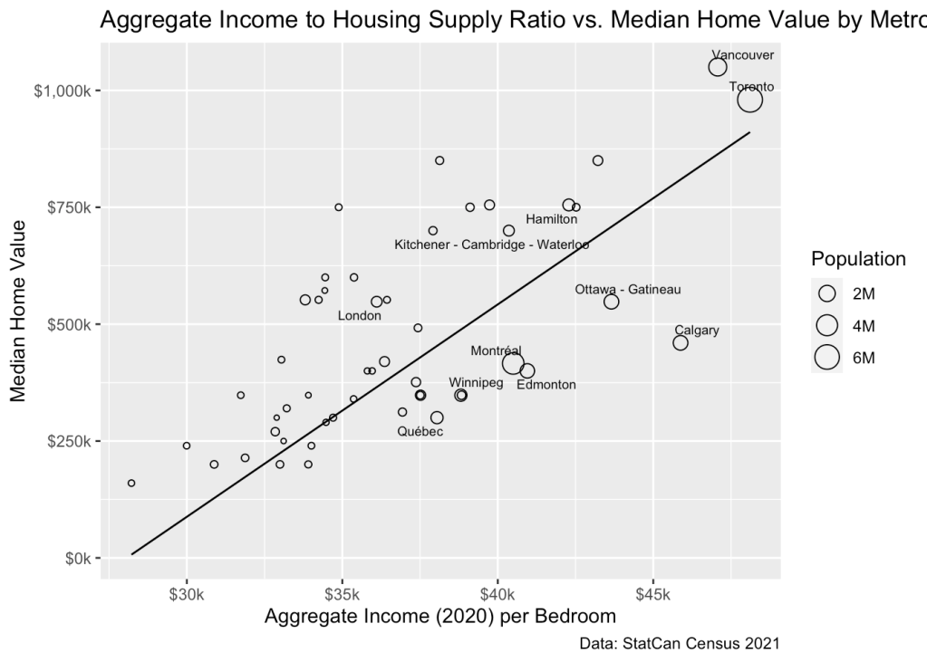 While this relationship is strong, it also looks heteroskedastic, and care should be taken when interpreting Figure 5. As pointed out above, the measure of dwellings is rather crude and does not account for quality. This may bias comparisons. For example Vancouver has a relatively high share of 1 bedroom apartments, whereas Calgary’s dwelling stock is dominated by single-detached houses. We can account for some of this variation in type of dwelling stock by crudely estimating the number of bedrooms in each region and normalizing the income effect by that measure rather than dwelling units, as shown in Figure 6.
