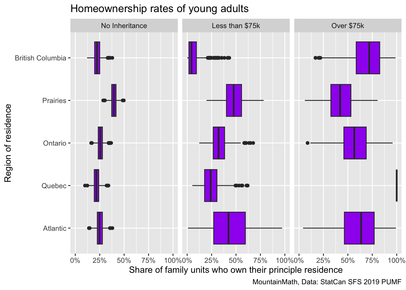 The Survey of Financial Security (SFS) has information about inheritances as well as how home owners financed their downpayments. Unfortunately this data source does not break down co-ownership of properties with parents. Moreover, the SFS PUMF only has broad geographic grouping and does not allow us to identify metro areas. We can break out provinces for BC, Ontario, and Quebec, compared to Prairie and Atlantic regions. This lumps together rural areas with the large metros in provinces with the highest dwelling values, likely reducing a good chunk of any effect there may be. But we can still compare how young adults financed their downpayment in different regions, and also get a look at how downpayments may be financed by several different sources.