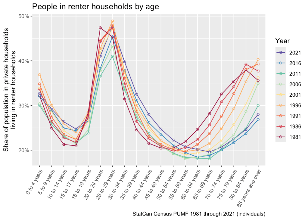 Indeed, when looking at the share of the population (in private households) living in renter households by age group in Figure 1, we see children generally living in owner households (with their parents), and the prevalence of living in owner households increasing with age as parents might have rented when the child was young and then transitioned into ownership. That changes once children reach the age of 18, at what point they start to live in renter households at much higher rates, peaking at almost half living in renter households at the age 25 to 29 years.