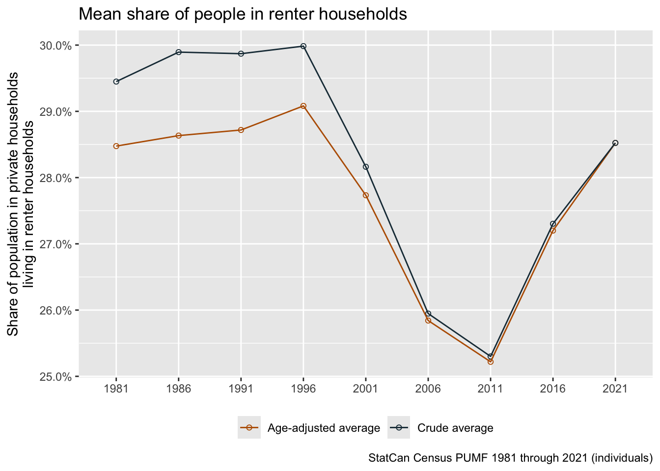 To understand the development of renter share over time Figure 2 shows the (crude) average share of people in renter households, as well as an age adjusted average, using the 2021 population distribution by age as a baseline. Age adjustment here helps account for how the early years of our timeline, in particular, included a lot of young Baby Boomers, who re-weighted the balance between owning and renting for the population as a whole as they moved through their life course.