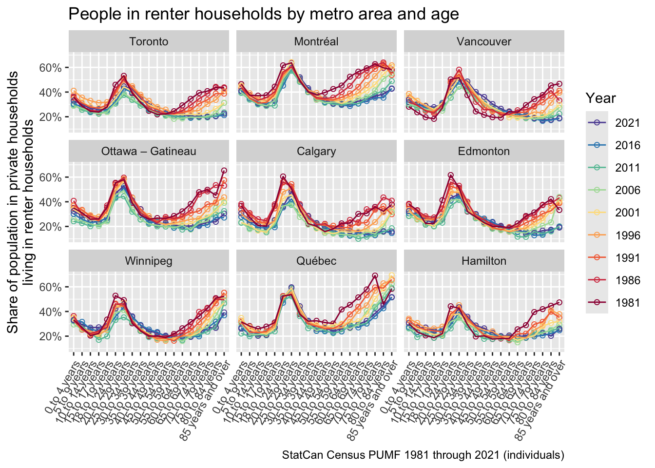 Perhaps not surprisingly, Toronto and Vancouver lead the housing frustrations of young adults unable to head up MHU households. But all metros have seen a gradual rise in the housing frustrations of the young, save for Québec City. By contrast, Québec metro areas lead for our measure of those still renting in middle age, even though the share renting there declines over time. This may not reflect frustration, in this case, so much as a different and changing set of norms. Renting through the life course has historically been more common in Québec, but has nevertheless been on the decline, mirroring a rise in access to home ownership for those desiring it. If people were frustrated about their access to ownership before (an open question), that frustration may have eased a bit over recent history. Anglophone metro areas tend to exhibit more of a wave pattern, with stable or rising shares renting from 1981, to a decline in 2006, and a rise in renting share since. We’re possibly seeing a bit of an effect from the Great Recession here, where ownership became harder to achieve as both mortgage rules and supply tightened through the Great Recession. By this measure, frustration in Vancouver was rising most quickly prior to 2001, and if it eased somewhat prior to the Great Recession, it has since returned with a vengeance, likely reflecting a middle-aged population feeling increasingly locked out from home ownership.