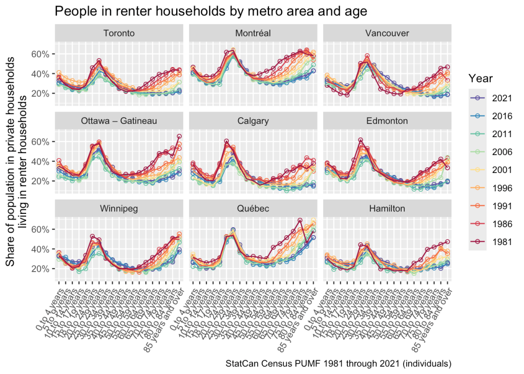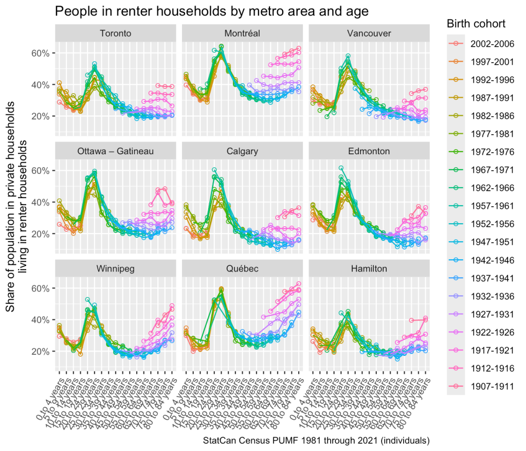 Once again, slicing the data by cohorts in Figure 5 shows that much of the shift we see, both in declining rentership for seniors, and delayed ownership for those middle-aged (in select metros) is due to cohort effects. Successive cohorts of seniors starting out with lower renter shares than their predecessors and kept these shares as they aged. In Vancouver, successive cohorts of those entering middle-age stayed renters longer before transitioning into ownership.