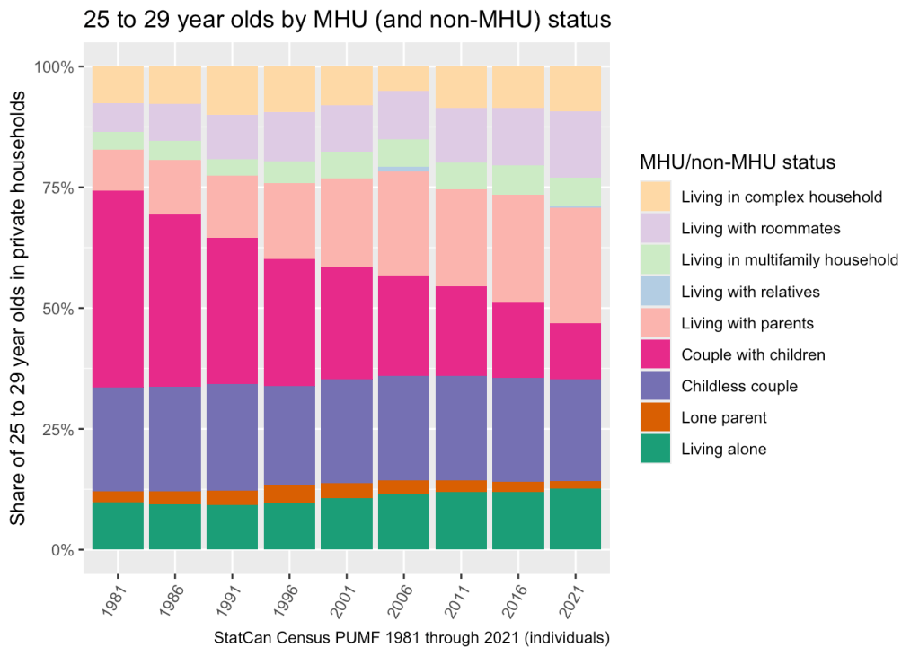 The big pattern here is the dramatic drop in the proportion of young adults living in MHU from 1981 to 2021. Meanwhile, older adults became increasingly likely up from 1981-2001 to live in MHU, before the pattern reversed somewhat from 2001-2021 except for all but the most senior (age 80+). On the other side of the lifespan, young children follow similar patterns as adults in their 30s and 40s – increasingly likely their parents. Insofar as the drop in the share of young adults in their late 20s living in MHUs is particularly pronounced, we zoom into this group in Figure 7 to highlight how this drop is driven by fewer couple with children households. Young people are delaying coupling and childbearing. This is made up for by an increase of children living with parents and to a somewhat lesser extent an increase in living with roommates, leading non-MHU situations (in pastel colours). In terms of MHU situations, those living alone also rose over time, but not nearly enough to make up for the decline in those living as couples with children. Those living as single parents rose and then dropped again and those living as part of childless couples remained stable, rounding out our MHU categories.
