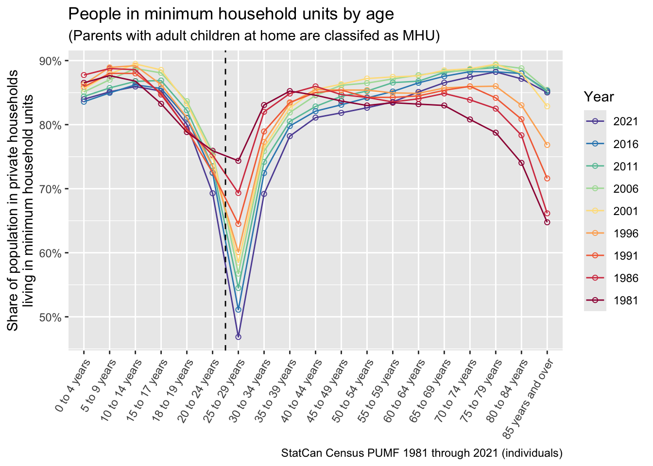 Figure 6 gives a quick overview of the share of the population living in Minimum Household Units by age group. The vertical dashed line between the 20 to 24 and 25 to 29 year old age groups indicates where we switched from considering children living with parents as being “dependent” children, and those still living in MHU if they live with parents, to no longer being in MHU if they still live with their parents. That cutoff is partially informed by census coding and the “usual place of residence” concept that might code post-secondary students as living with their parents, even though the live elsewhere for most of the year.