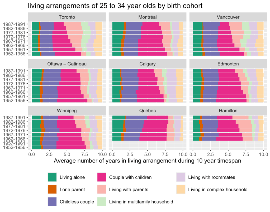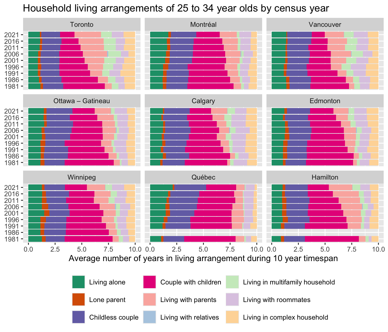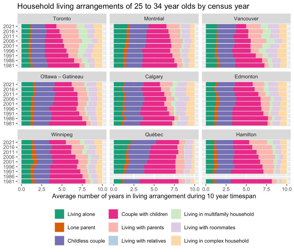 All areas saw a strong decline in time spent in couple with children households over this time period. In Metro Québec this was made up for by an increase of time spent living alone and by childless couples, so that MHU households overall remained stable. A similar but less pronounced replacement of couple with children households by other MHU households occurred in Montréal. Elsewhere, in more Anglophone metro areas, there was little change from the left (in the time spent living alone and in childless couple relationships) to compensate for the decline in time spent in couple with children households. Mostly, young adults increasingly found themselves in the non-MHU household situations on the right, especially continuing to live with their parents, a pattern especially pronounced in Vancouver and Toronto.