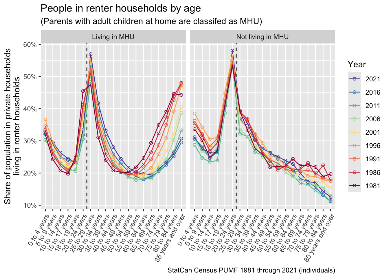 Overall it seems clear that rental housing plays an important role at enabling young adults to live in MHU, and from there they tend to transition into ownership as they age, with transitions taking progressively longer over time. Renting has also enabled aging adults to maintain the independence of an MHU household, whether in the face of unexpected relationship dissolution, or moving to a desirable retirement destination. But this has become less important over historical time, as older adults have become more likely to obtain and hold onto both independence and home ownership. Remaining in non-MHU status (especially living with parents, but also living with roommates) offers a more linear path out of renting in terms of how it relates to age. Indeed, the seniors in non-MHU households are, in many cases, likely the owners of homes they share with their adult children.