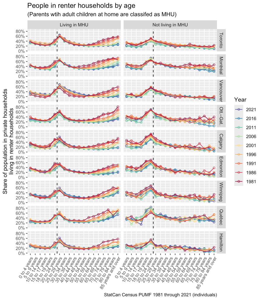 Figure 9 breaks this down by major metro area. The patterns are broadly similar between metro areas, with some, in particular Edmonton, showing an earlier peak in MHU households already at the 20 to 24 year old age.