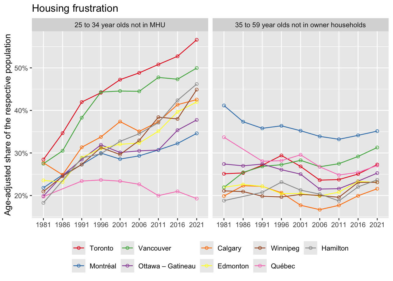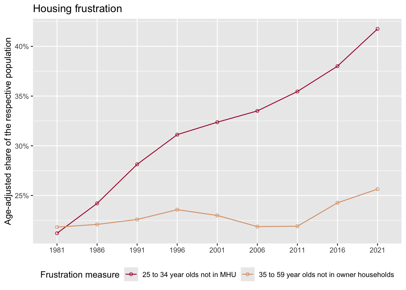 How does owning or renting relate to household independence across the life course? How have these relationships changed over recent history? We use Census data from 1981-2021 to check in on historical relationships between age, tenure, and household composition. From these we develop a couple of preliminary demographic metrics of housing frustration. Patterns suggest that frustration abounds.
