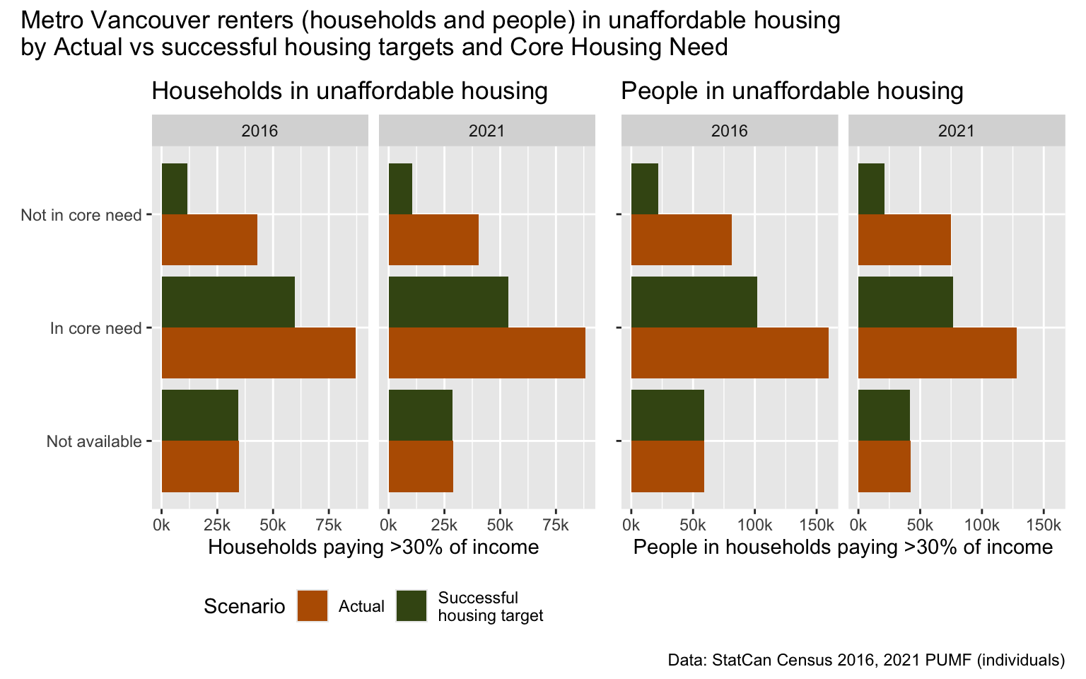 Again, this comparison shows that meeting housing targets would lead to large reductions in the numbers of people and households stuck in unaffordable housing, both for those in Core Housing Need and whose needs are currently considered met. By contrast, meeting housing targets does next to nothing for people excluded from the Core Housing Need measure. This is not surprising insofar as these are situations where income tends to be the largest factor for reasons explained above.