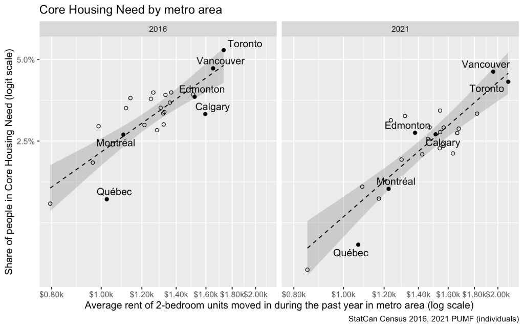 Both of these are difficult, but we can give a rough estimate. The second one is particularly challenging to model directly. Here we will model the change in net migration as a residual via the difference of the new number of dwelling units, discounted by an assumed natural vacancy rate, and new household formation by existing dwelling units. This can introduce sizable errors and needs to be treated with caution. We then estimate the share of households in Core Housing Need or with shelter-cost-to-income mismatch by assuming that the overall makeup of the population moving into the region is comparable to the ones already in the region.4 We then anchor these estimates by estimating the relationship between metro level prevailing rents and Core Housing Need or shelter-cost-to-income mismatch separately, introducing an alternative method to estimate the overall distribution of households struggling with shelter costs that include both households made up of the existing population as well as newcomers.