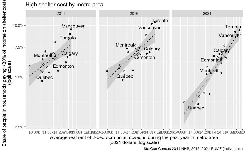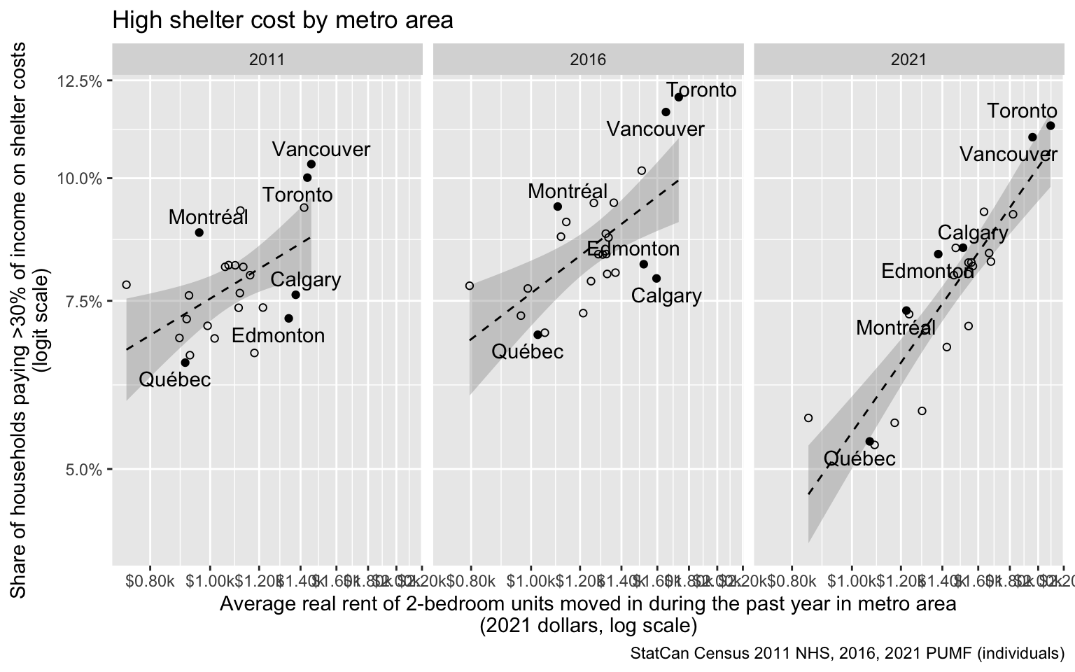 Just for completeness we shift from people to households with high shelter cost in Figure 14. We see the relationship looks quite similar.