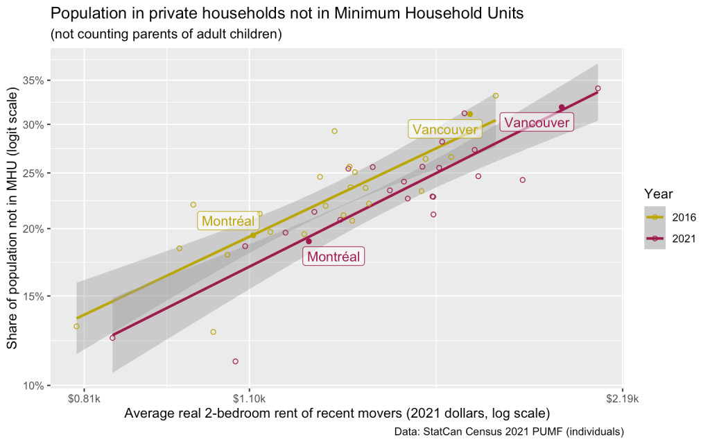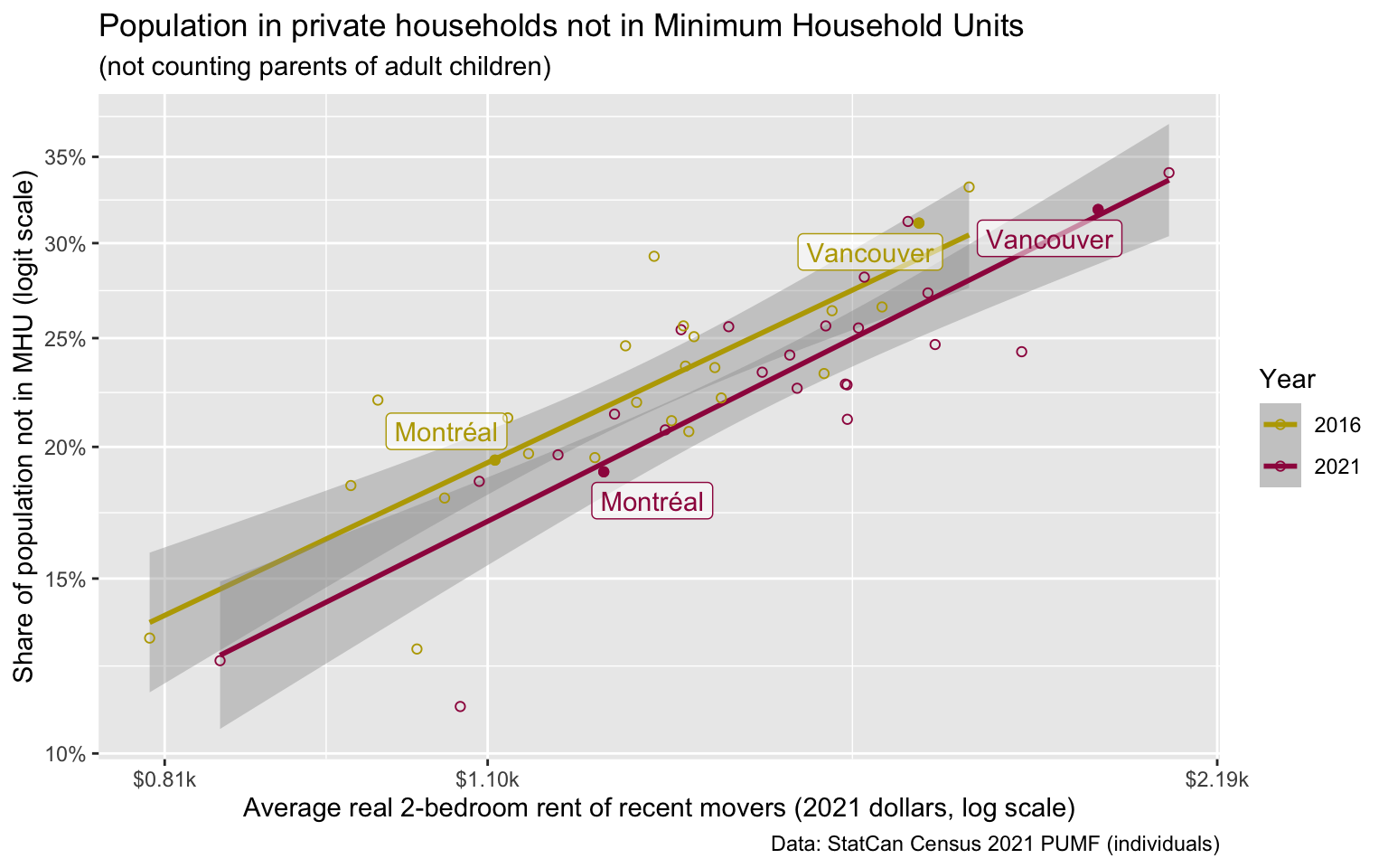 There are some caveats for interpreting this relationship causally. The simplified linear plot is missing some important confounders, in particular income, couple status, and some measure of cultural openness to non-MHU living arrangements. The outlier in the lower left, Metro Québec, has high incomes and a comparatively homogeneous cultural makeup. We investigate this in more detail elsewhere (Nathanael Lauster and von Bergmann 2024) to show that even after accounting for these (and other) factors the relationship between rents and MHU status remains of similar strength and there is good reason to interpret it causally. Taking this graph at face value it suggests that a 30% reduction in rents leads to a 9 percentage point reduction in the share of the population not in MHU, bringing Vancouver close to Montréal’s share.