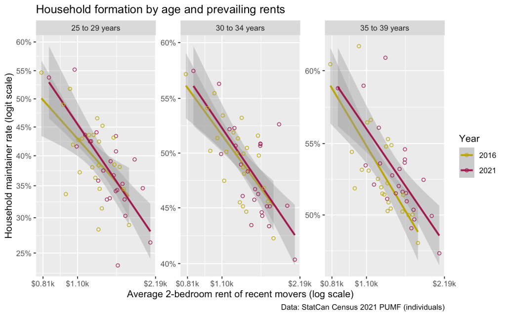 Reversing this interpretation and using a slightly different measure, we can look at primary household maintainer rates (also known as household headship rates). Statistics Canada defines this as the first person listed in the household roster who contributes to paying rent, mortgage, or other shared household costs, so only one person is identified as the primary maintainer for every household. This isn’t quite as neat a measure as MHU status, insofar as, e.g., a two-person household containing a couple, two roommates, or a parent and adult child would all have the same maintainer rate (0.5), even though we’re probably only safe in assuming the couple would continue living together if a free apartment was offered (and even this might be debated!) But household maintainer rates are easier to calculate than MHU status, and provide us with another check on the underlying relationship to rent. Figure 18 provides a look at this relationship, which largely replicates the MHU analysis above. As rents go up, household maintainer rates go down.