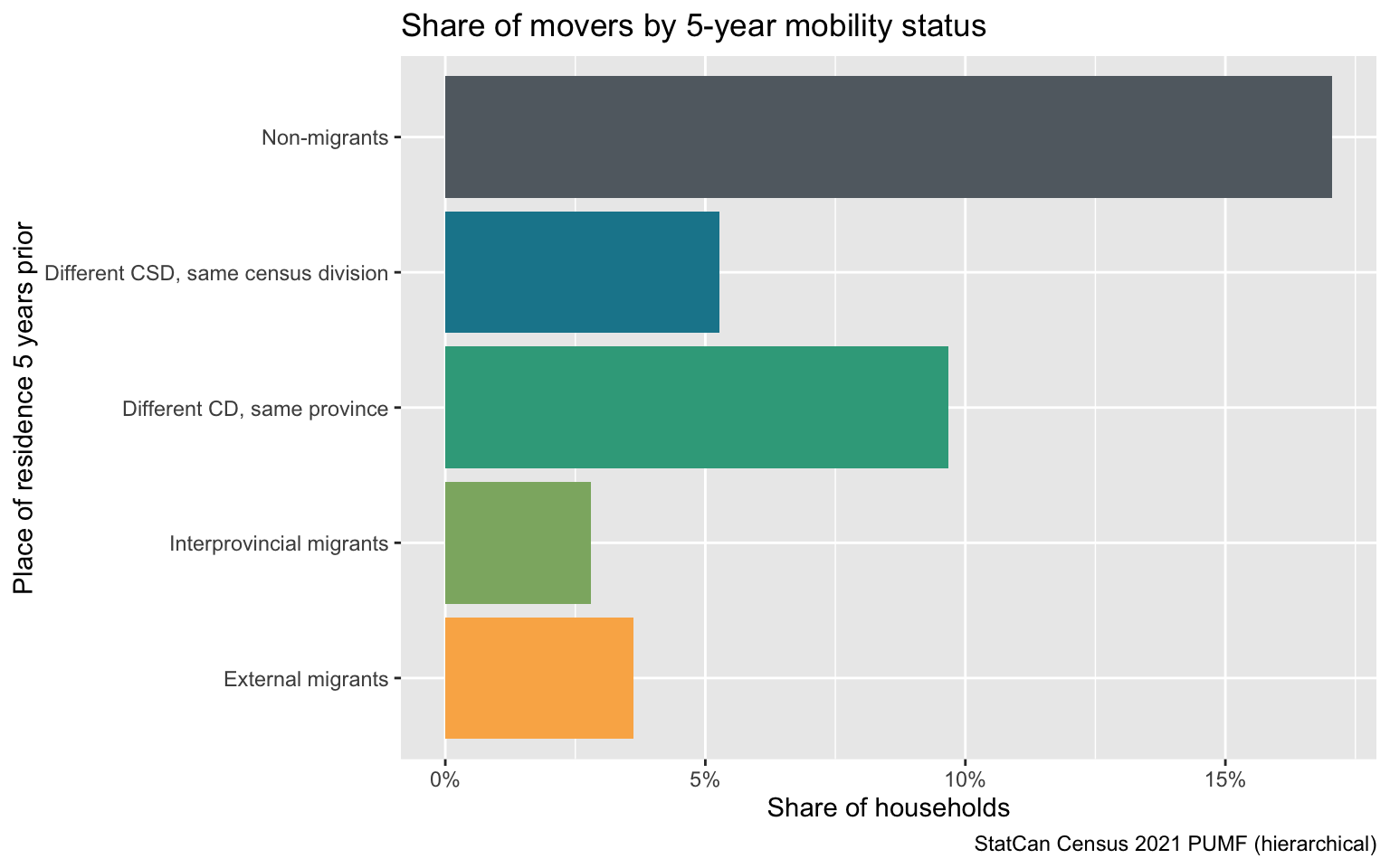 11% of Canada’s households1 lived at a different address on census day in 2021 than a year prior, identifying them as movers. And comparing addresses enables StatCan to identify the start and end points of moves, as Figure 1 shows, with a little over half of all movers moving within the same municipality or CSD. StatCan labels these movers “non-migrants” to compare to migrants, with the latter including those moving between municipalities, either within the same census district; between census districts within the same province; or between provinces. There are some complications due to geography (e.g. Vancouver has lots of municipalities in its census district while the City of Toronto is it’s own census district), but generally moves further down the figure represent moves across greater distances, and the data speak to a common pattern: most moves are local.