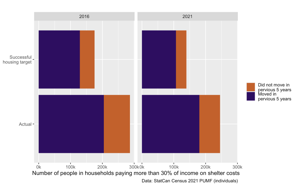 The question we ask is how many of these households would still be in unaffordable housing if we met our housing targets, building enough housing to drop prices and rents of (new) housing by 30%, a figure well in reach based on work by CMHC (CMHC 2018) and explained in our previous post on housing targets. (von Bergmann and Lauster 2023a) Dropping prices and rents won’t alter the affordability situation of existing owner households, but it will make a difference for existing renters that we can easily simulate in the data as shown in Figure 9.