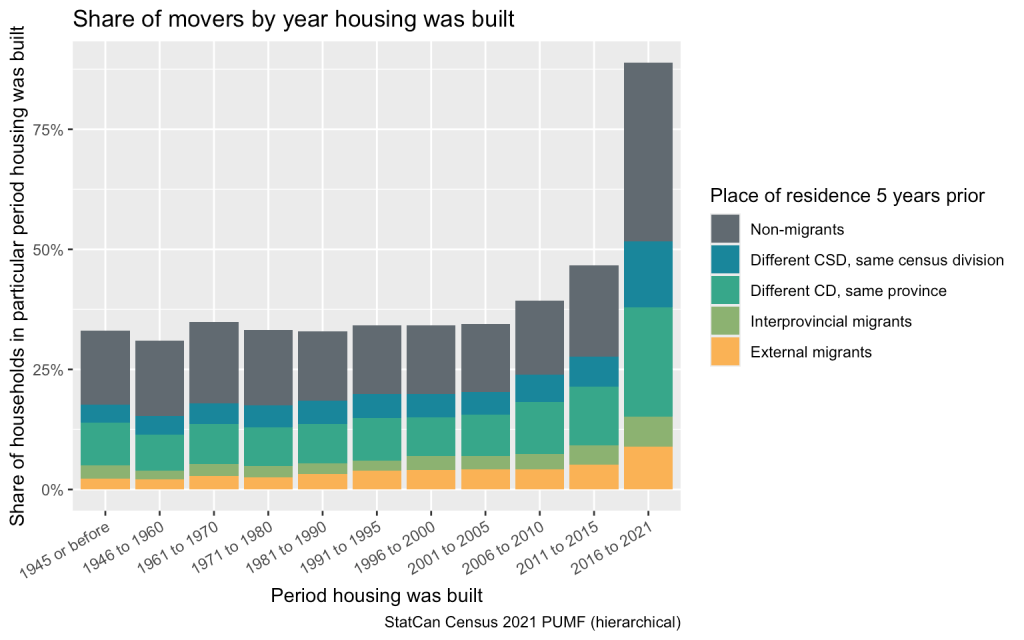 What kind of housing did these movers move into? Only 6.8% of Canada’s (occupied) housing stock was built January 2016 to May 2021, so the majority moved into old housing. In Figure 3 we make that more precise by looking at mobility status by year the housing was built.