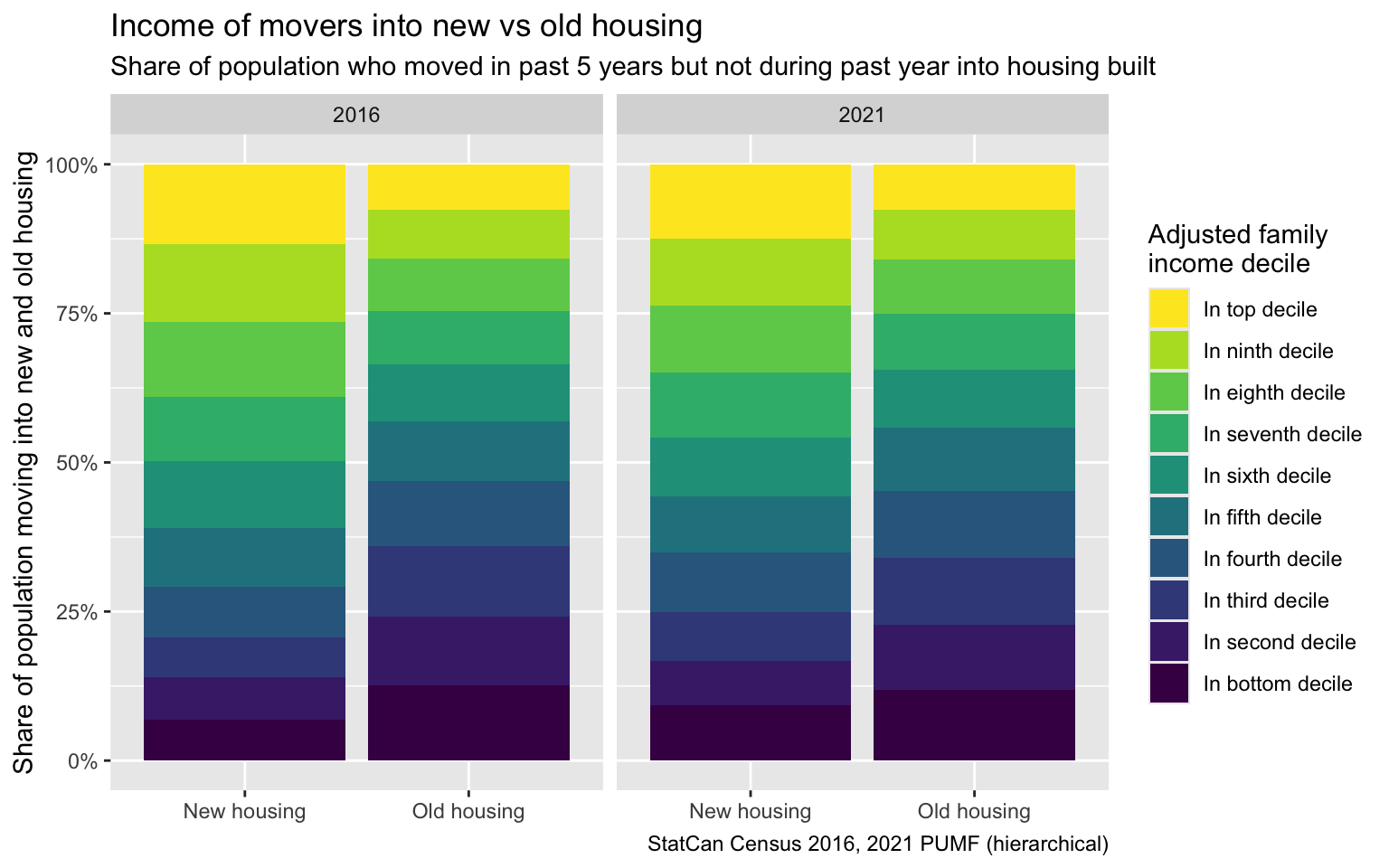 Comparing both census years, we can see that there are some differences between new and old housing, with those moving into new housing being slightly overrepresented in higher income deciles relative to those moving into older housing. This pattern was stronger in 2016 than 2021. By 2021, the median mover into new housing is in the sixth income decile, while the median mover into old housing is in the fifth. Importantly, and across both Census years, both old and new housing contain all adjusted family income deciles. We can see that even without filtering effects, new housing directly houses even the lowest income households.