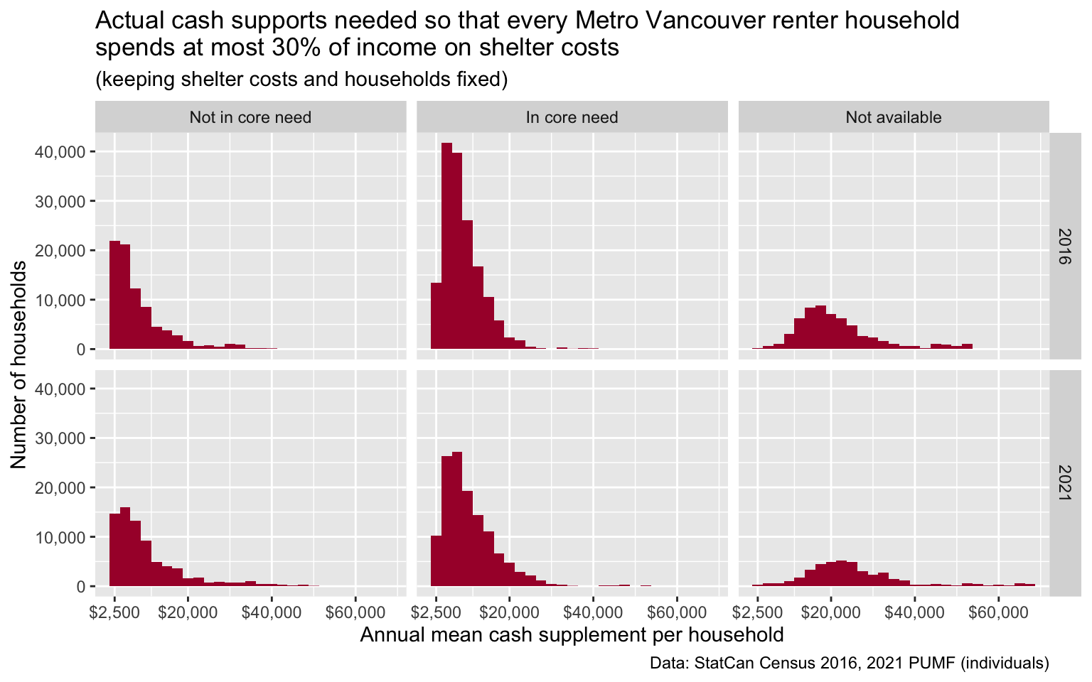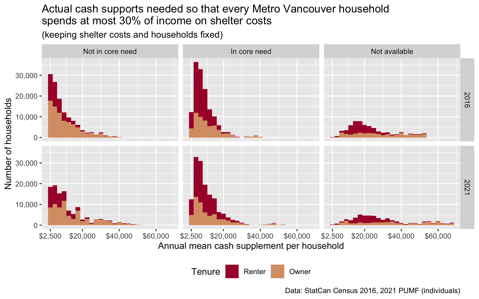 In Figure 7 we split this by tenure and by Core Housing Need status and show the distribution of cash subsidies needed to lift households out of unaffordable housing. As a reminder, Canadians are considered to have their Core Housing Need met (“Not in core need”) when their housing is affordable (<30% income), suitable (has enough bedrooms for resident mix), and adequate (in good repair), or their income would allow them to afford other housing locally that would meet their needs. Those considered to be in Core Housing Need (“In core need”) are households who fail this test. Except that some households are excluded from this measure (“Not available”), including those with shelter cost higher than income, as well as some non-family student households. As we can see there remain households deemed not to be in Core Housing Need who still have shelter costs higher than 30% of income. Here the CMHC assumes their income suffices to pay the median rent of alternative local housing that would meet their needs (i.e. they are likely choosing to pay more in rent because of amenities).