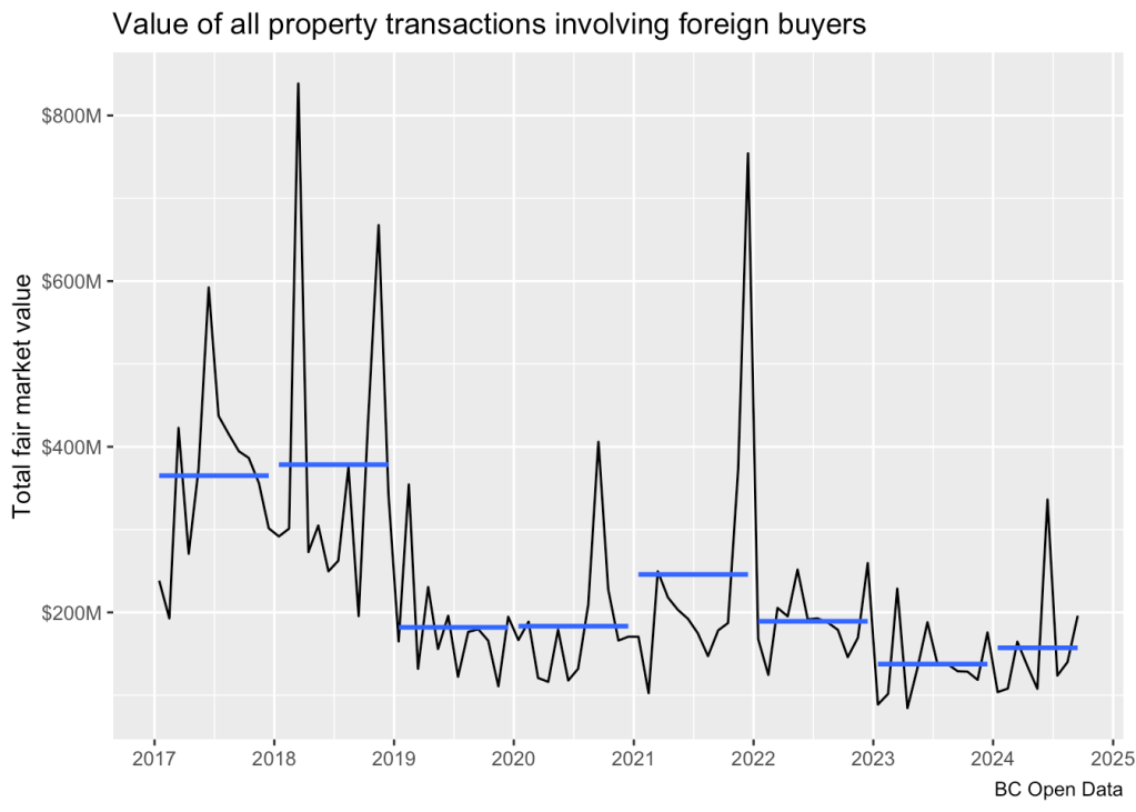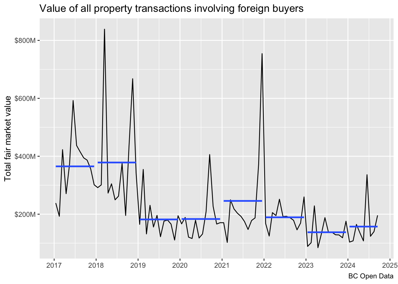 Using property transfer tax data provided by the B.C. government, Simon Fraser University associate professor Andy Yan showed that residential purchases categorized as “foreign involvement transactions” had a total dollar value of nearly $664-million from January to September, 2020. In that same period this year, 834 foreign involvement residential transactions added up to nearly $824-million. The dollar value of foreign residential transactions in 2023 was $744.5-million. The total number of foreign transactions, including commercial, increased from 1,018 in 2023 to 1,020 in 2024.