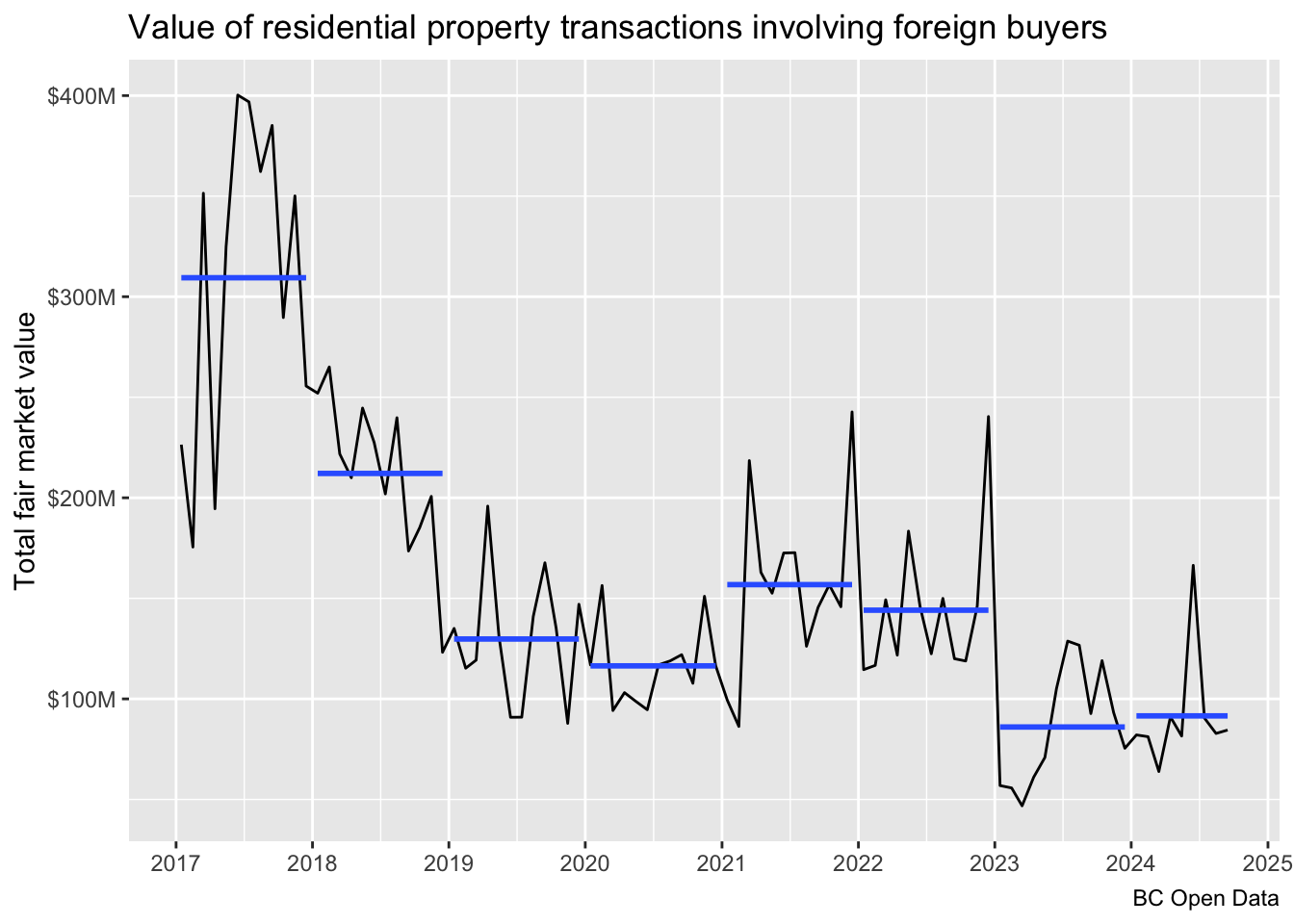 Looking at this the opening claim in the article that “foreign buying in British Columbia spiked in dollar value this year” is untenable and directly contradicted by the data, undermining the entire narrative of the piece.