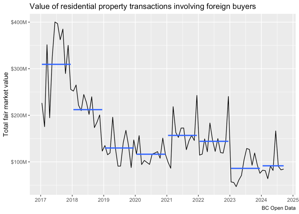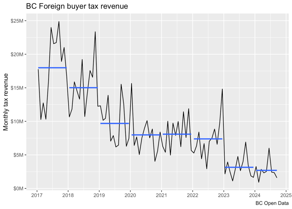 B.C.’s foreign buyer tax revenues ranged from $51-million in 2020 to a high of $71-million in 2021, to $24-million in 2024.