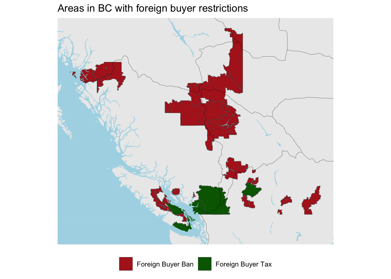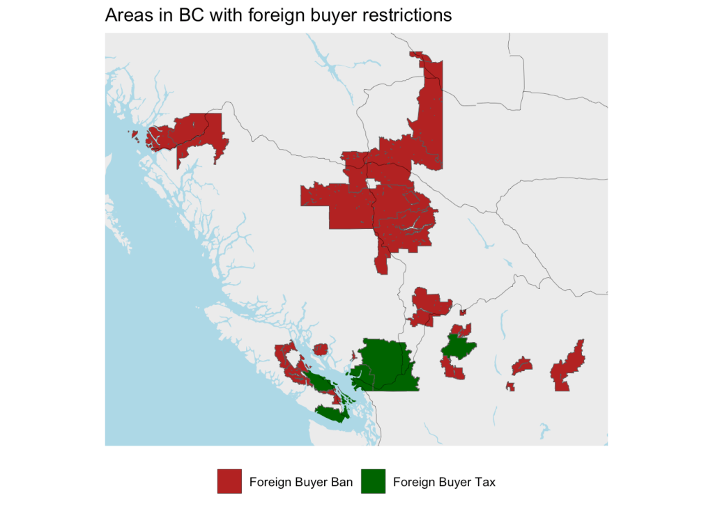 Though the article does not mention this, BC’s Foreign Buyer Tax does not apply everywhere in BC, so this misses purchases with foreign involvement outside of the FBT areas. The article is also mum on the federal Foreign Buyer Ban not applying everywhere but only in another additional subset in BC as shown in Figure 2, and applying to a different set of people than the Foreign Buyer Tax.