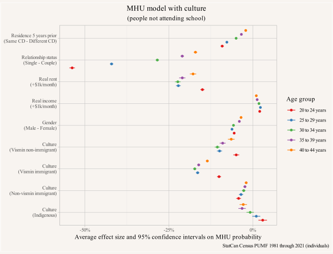 But what happens when we add “Culture” into the model and try to assess it’s impact on the relationship? Given the model utilizing data back to 1981, and working under the constraints of variables available in the PUMF data (not having access to the full sample of the census for this work), we lack the ability to include fine subgroups. Instead we settle for broad categories built from visible minority status and immigrant generation.1