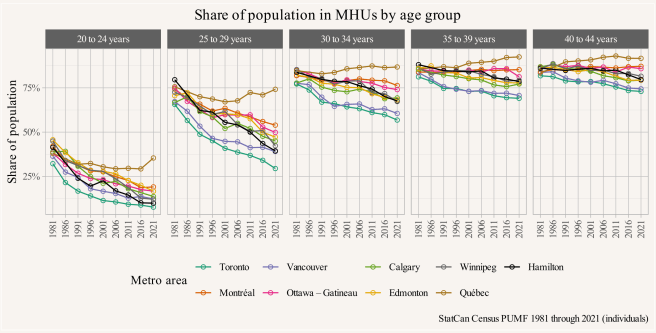In our new paper “The new rules: housing shortage as an explanation for family and household change across large metro areas in Canada, 1981-2021” (Lauster & von Bergmann 2025) (preprint and replication code) we estimate the impacts of housing shortage on the substantial variation we see in family and household structures, both across large metro areas in Canada and across time, focusing on 1981 through 2021.