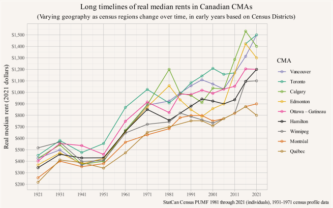 The shift toward MHU arrangements maps onto rising desire for privacy and autonomy and a decreasing tolerance for various forms of servanthood, boarding, and lodging arrangements that used to be more common. This declining tolerance was also often directed at lodging houses and apartment buildings, ultimately resulting in various states of housing shortage across Canada. We provide a long-term view of rents across Canadian metropolitan areas as a measure of evolving housing shortages.