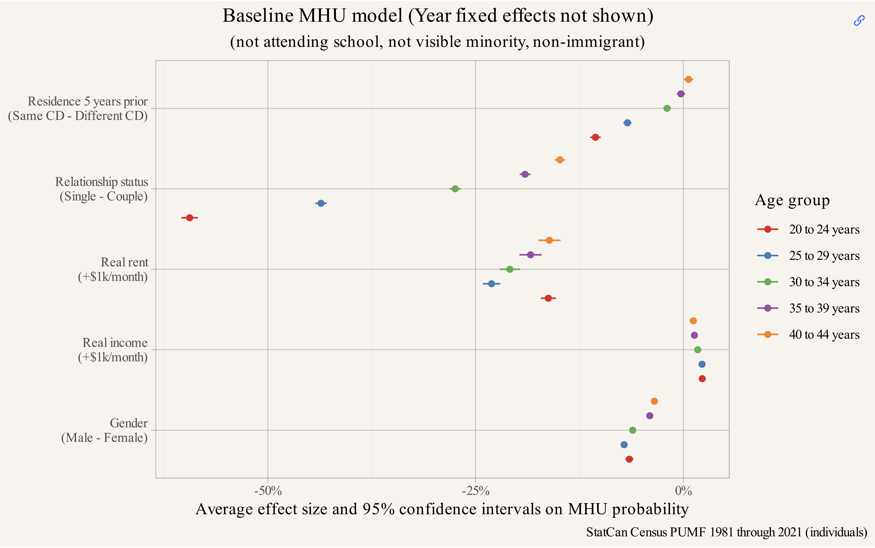 But what happens when we add “Culture” into the model and try to assess it’s impact on the relationship? Given the model utilizing data back to 1981, and working under the constraints of variables available in the PUMF data (not having access to the full sample of the census for this work), we lack the ability to include fine subgroups. Instead we settle for broad categories built from visible minority status and immigrant generation.1