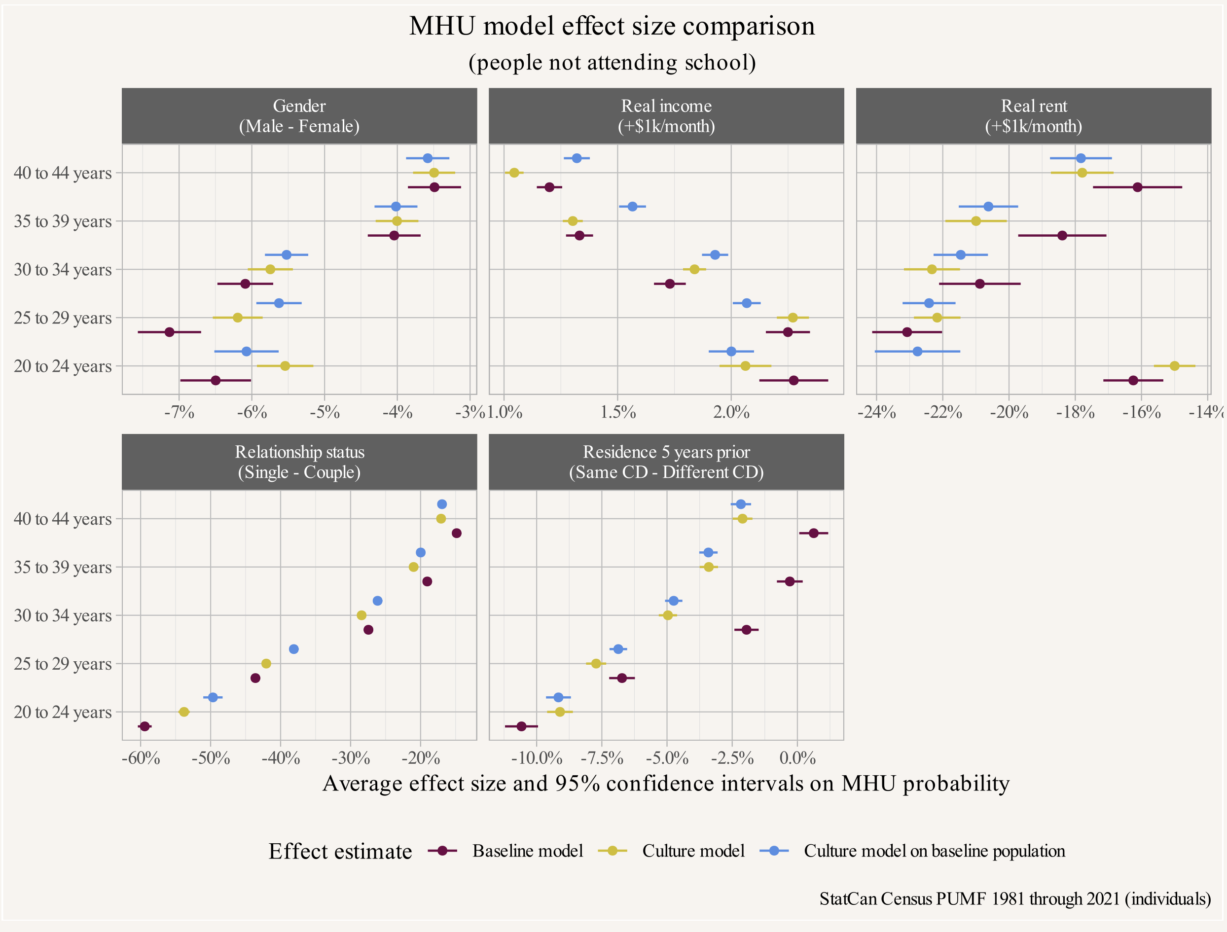 Our results do show an impact of “Culture”, especially for immigrants, as the estimated effect sizes are now averaged across the overall population. For an apples-to-apples comparison of the models including and excluding culture we can estimate the effect size of the culture model on the same baseline population we used in the baseline model.