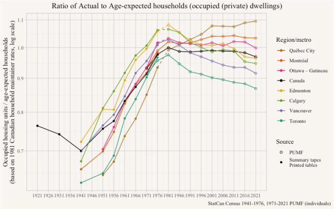 To dive a bit further into the technicalities of assembling this figure, we split the time series into parts where the data was derived from the PUMF and that derived from published census tables and electronic summary tapes, noting these data series are not strictly comparable because the PUMF data allows for filtering on the population in private households, whereas the older data looks at the total population which is not quite the right metric to use here. In cases where the time series don’t overlap we connect them via dashed lines. Moreover, in older censuses the households concept was somewhat floating in definition as well as how enumerators coded this. (Wargon 1979; Harris 1994). Misalignment is small if age data as well as households counts are for the entire population, including households in collective dwellings, but larger discrepancies emerge if e.g. ages are reported for the entire population but household counts are only reported for private households, as is the case in the 1976 summary tapes. We adjusted the 1976 ratio to roughly account for this discrepancy. Some of the fields in the 1961 and 1966 summary tape data have coding issues, we replaced some of the data with manually entered data from the printed tables as appropriate. Consistency of reporting for older censuses is less clear and actual values may differ somewhat from the values we report in the graph; discrepancies because of inconsistencies in the consideration of private vs collective dwellings can result in a roughly 3% deviation from our reported ratios. Our time series for Canada exhibits a large kink in 1941, corresponding to a severe housing shortage caused by the Great Depression & WWII, triggering the government to directly participate in housing construction via the crown corporation Wartime Housing Limited it created for this purpose. (Wade 1986) The concept of Metropolitan areas (or “greater cities”) was introduced in 1941 and is not available prior to that. Metropolitan area boundaries adjust over time.