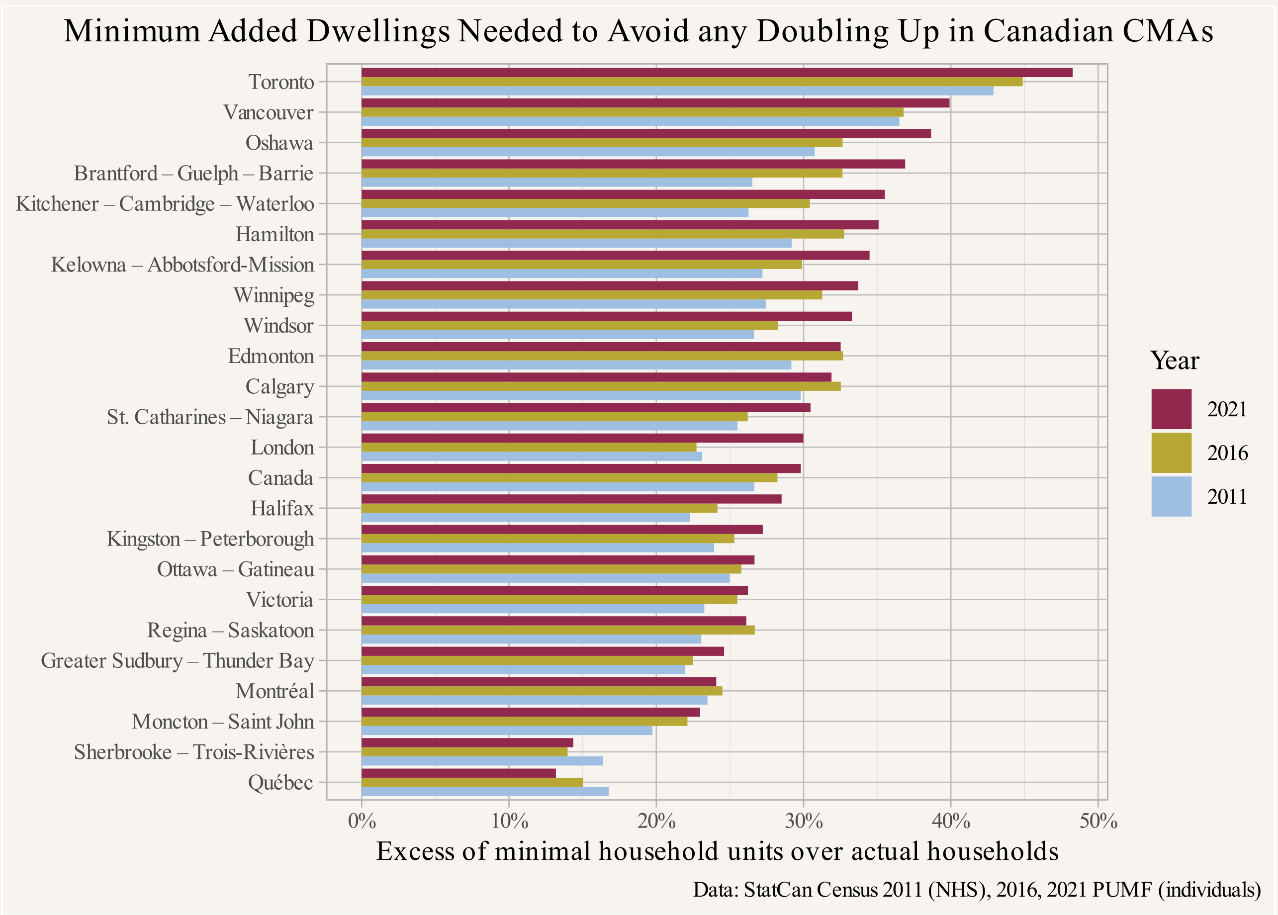 No matter which metric we pick, we end up with a significant number of families and individuals who would have to share homes, and in some metro areas that number is excessively high – to the level that it would require very strong government incentives to get enough people to share homes in order to make the numbers work. Some doubling up is voluntary, and metro regions at the lower end of the spectrum put some rough bounds on how much that might be given our general economic conditions in Canada. Of note, during the eras of state and work unit allocation in China and Russia, doubled up families remained strikingly common, with lengthy queues for young adults to achieve apartments of their own (Forrest and Izuhara 2012; Zavisca 2008). For instance, as Zavisca notes, “In 1985, the Soviet government estimated that 40 million new housing units, or a doubling of the housing stock, would be needed to provide separate dwellings for all families.” Dispensing with the trappings of capitalism did not, in fact, solve housing shortage.